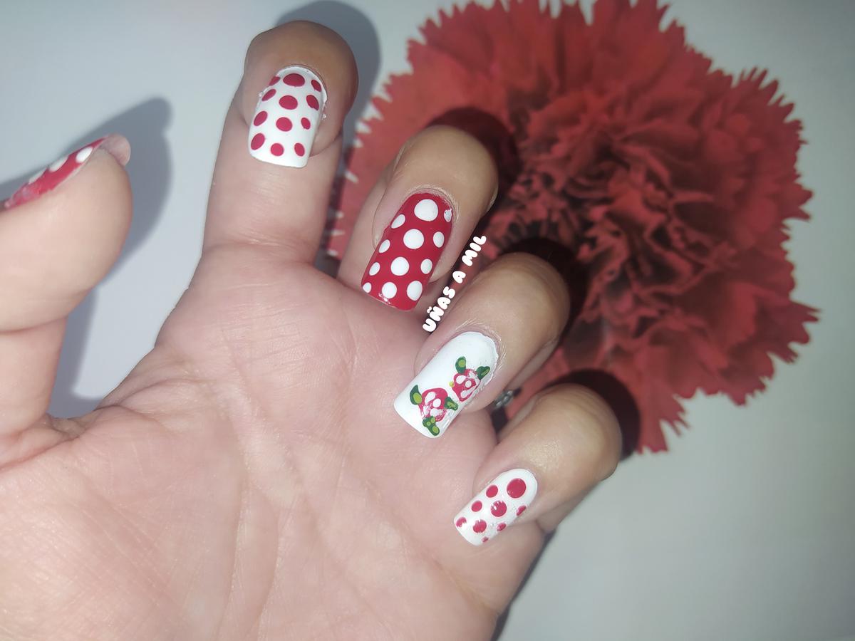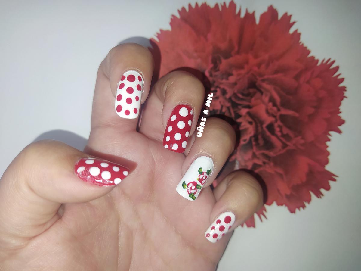 ¿cómo estáis? Hoy os voy a enseñar un diseño de uñas muy flamenco, en blanco y rojo con flores y lunares. Si te interesa saber cómo lo he hecho, sigue leyendo…