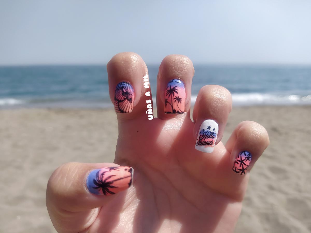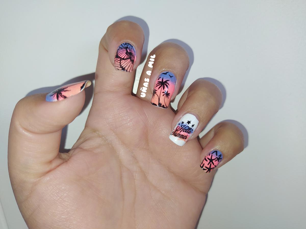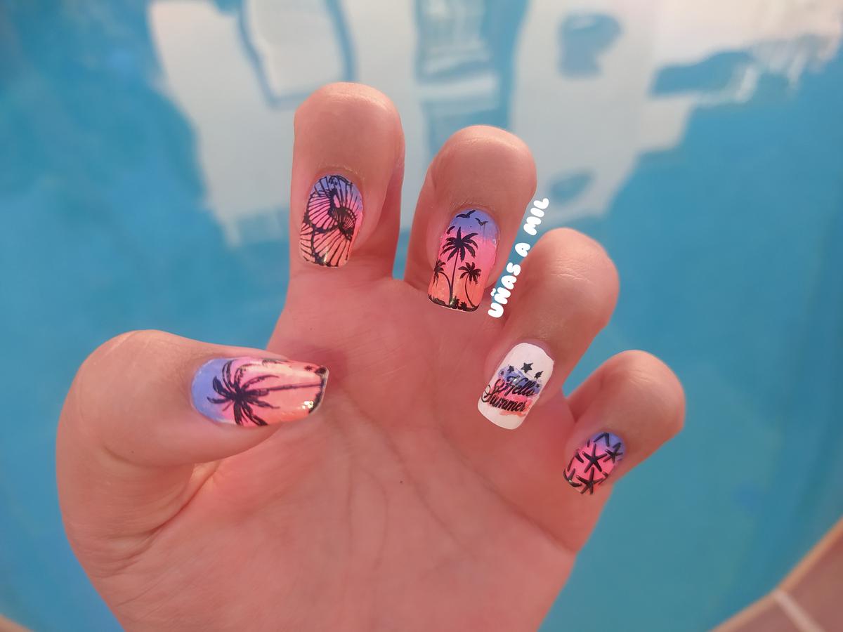 Pues hoy no os podéis perder este diseño de uñas de lo más veraniego y llamativo: un difuminado/degradado con palmeras, ideal para verano, festival y playa.