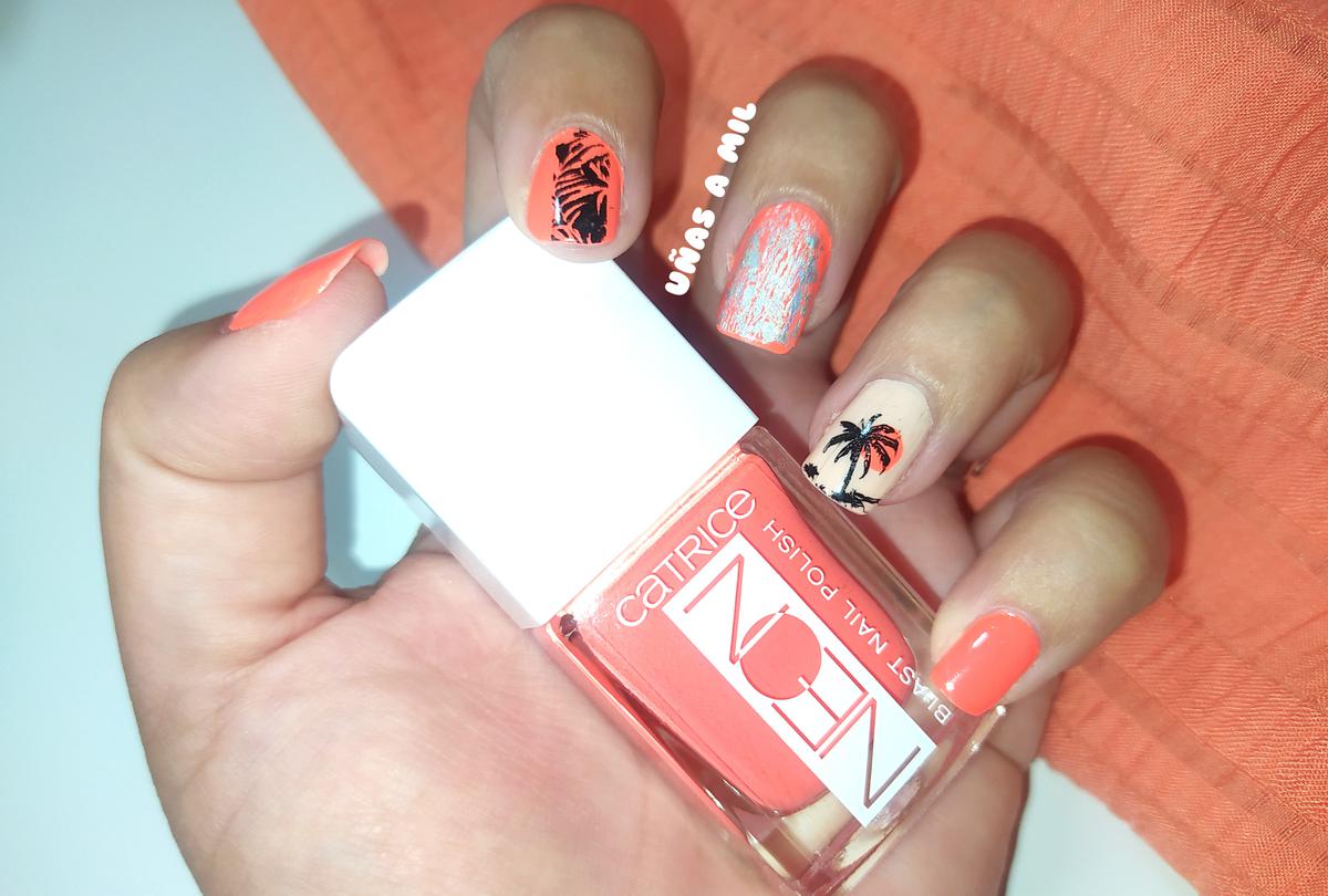 Hoy os voy a mostrar un diseño de uñas ideal para verano y festival, en color naranja fosforito/flúor con palmeras.