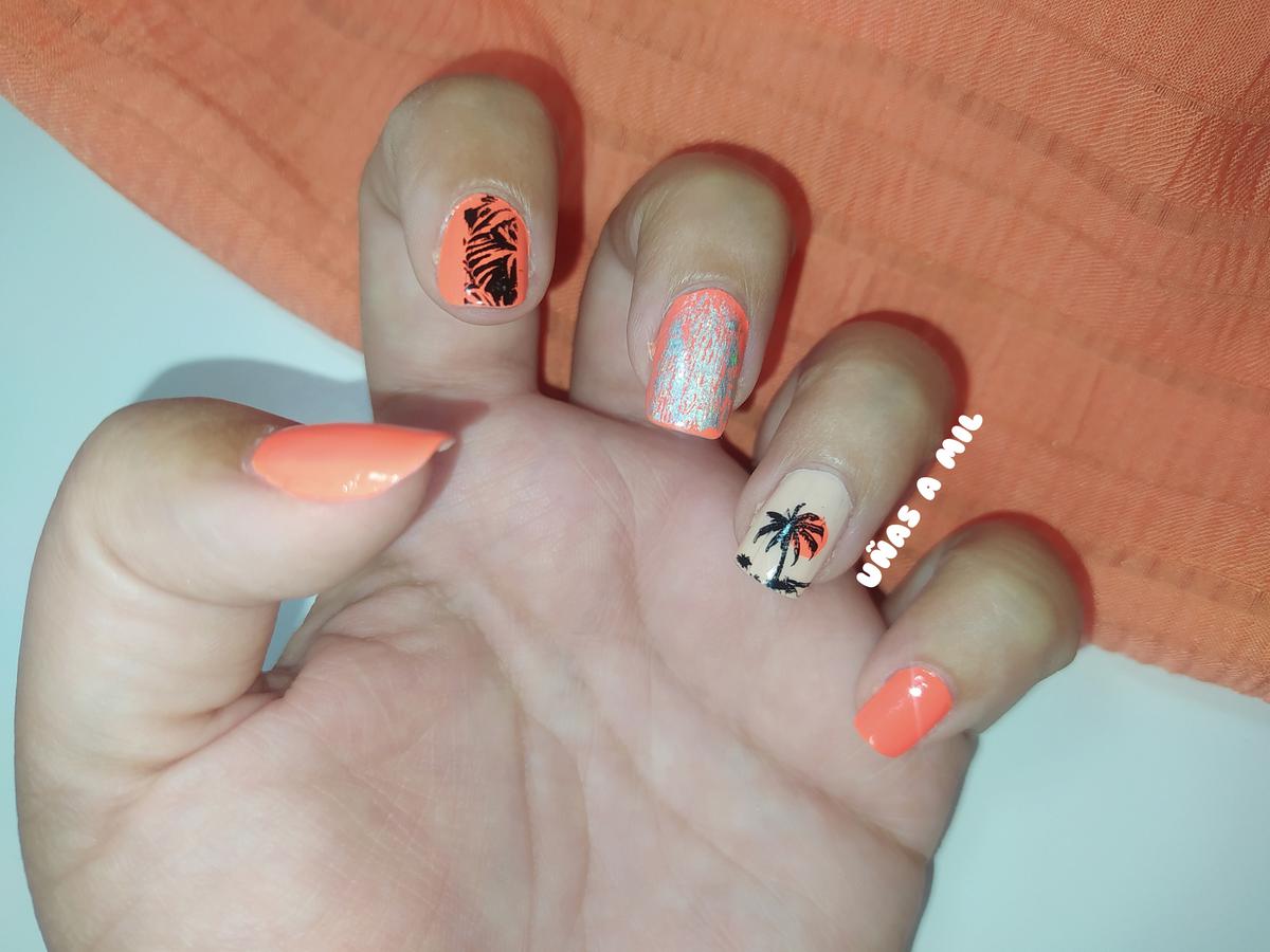 En la uña del dedo anular, he utilizado el esmalte en tono salmón muy clarito de Wynie, y he simulado un atardecer con la palmera.