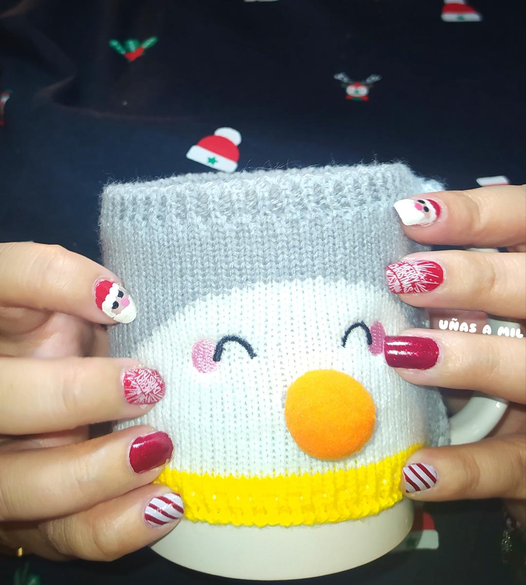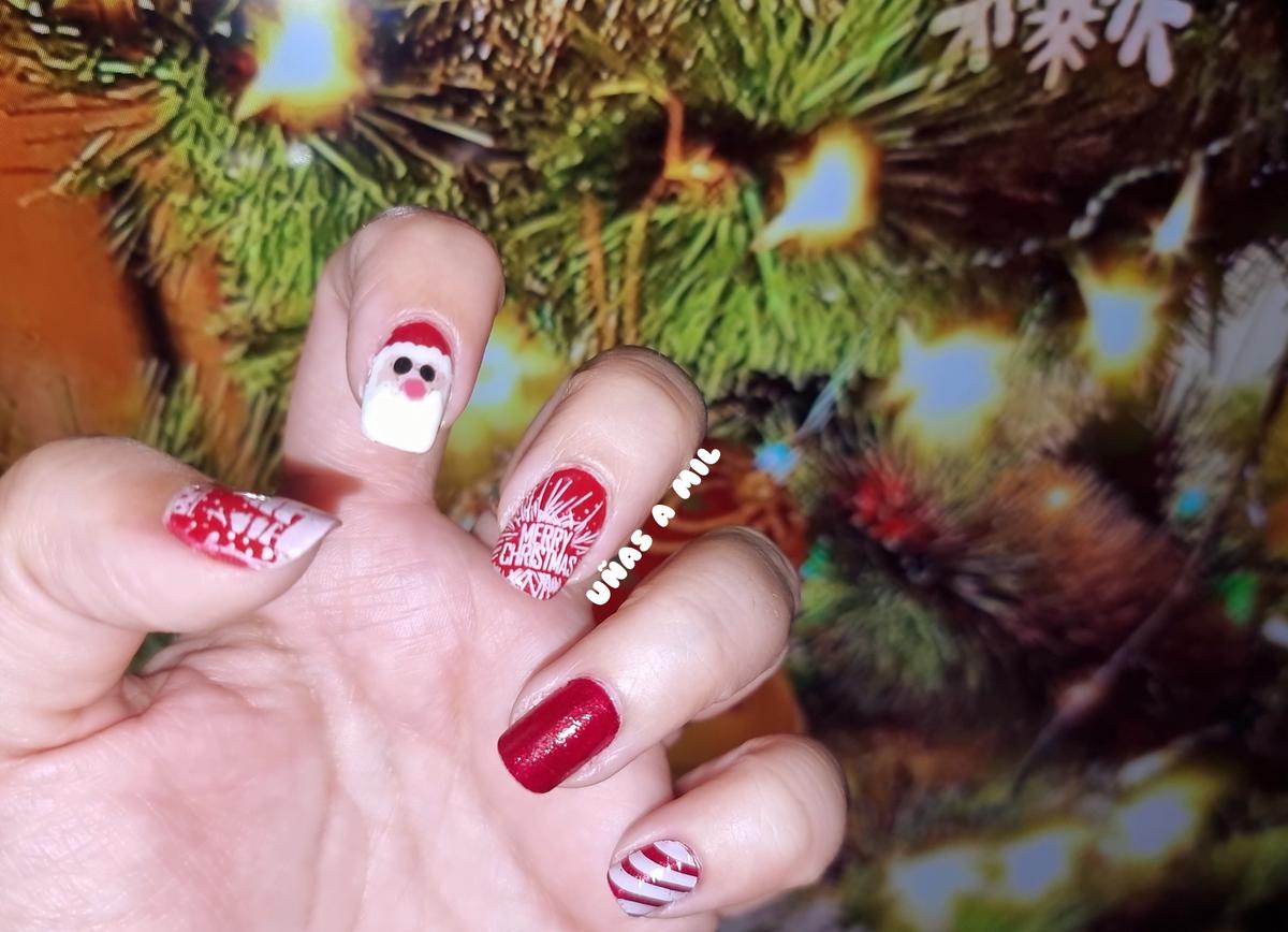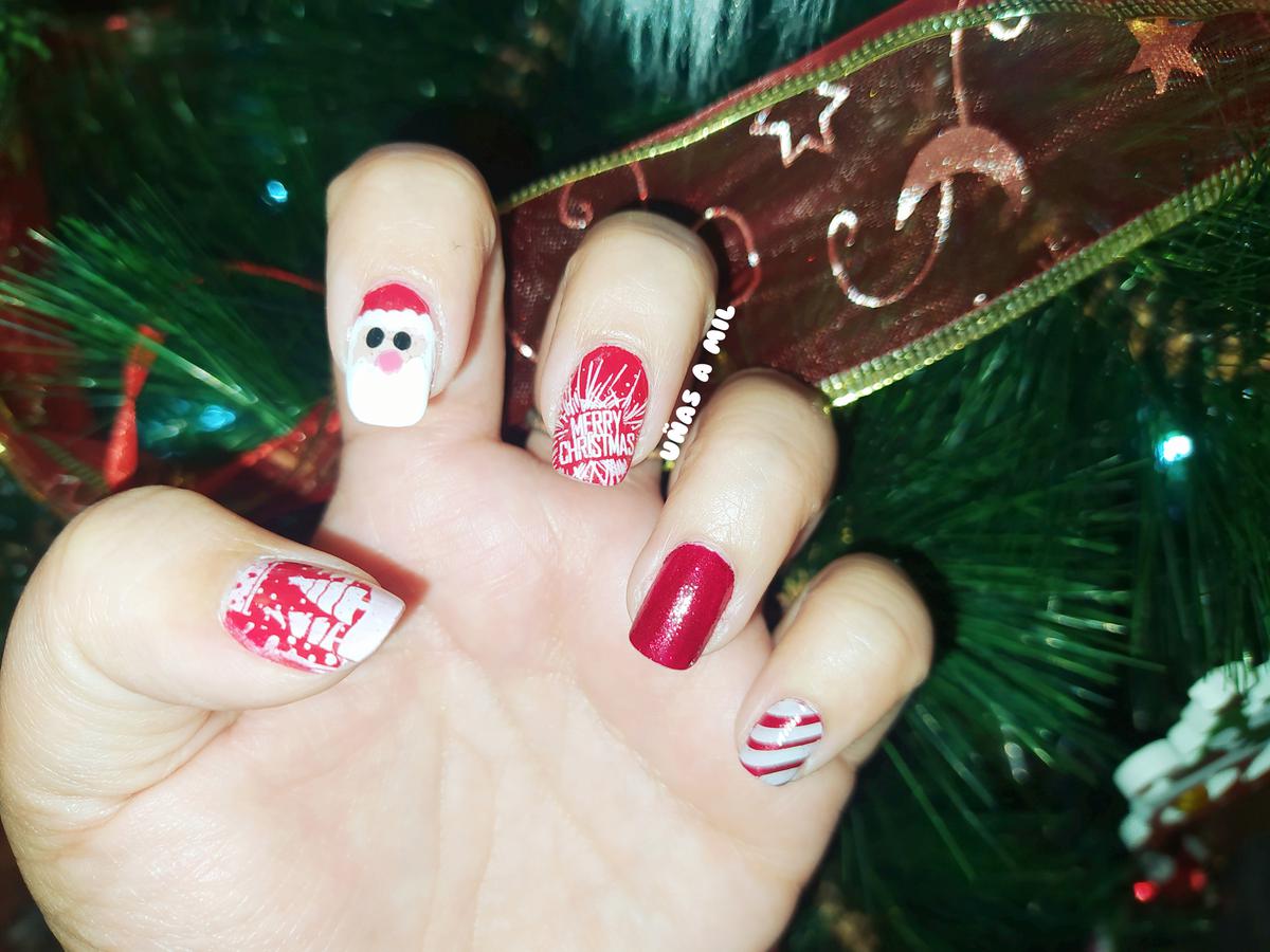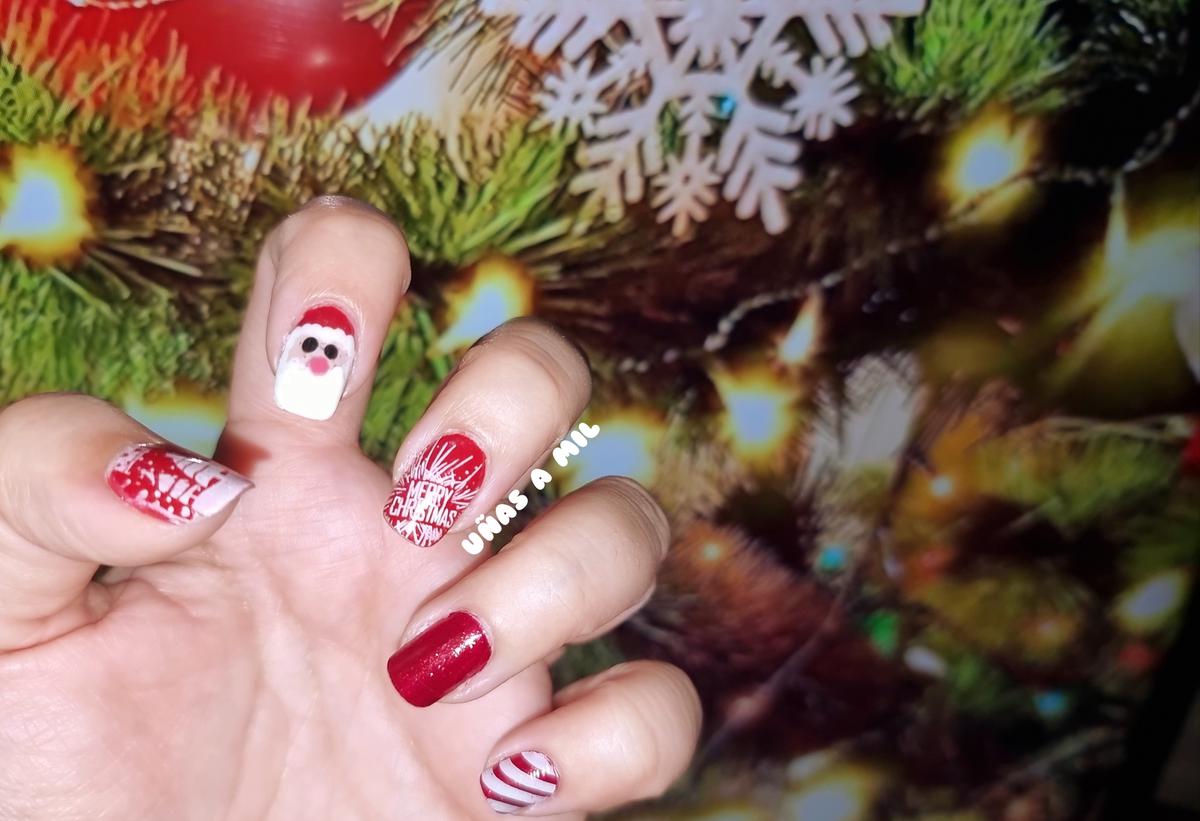 Como podréis observar, para esta manicura he utilizado distintas técnicas: a mano alzada he dibujado a Papa Noel y el resto de uñas ha sido estampación con distintas placas de diseños navideños de las marcas Essence, Born Pretty Store y Kads Nail Art.
