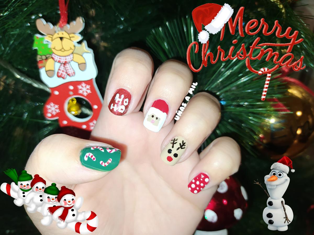 En cada uña he pintado un dibujo navideño diferente: bastones de caramelo, papa noel, reno, nieve…y he utilizado esmaltes de lo mas variado también: Wapa Cosmetics, Primark, Revlon, Essence, Rare Nails y Masglo.