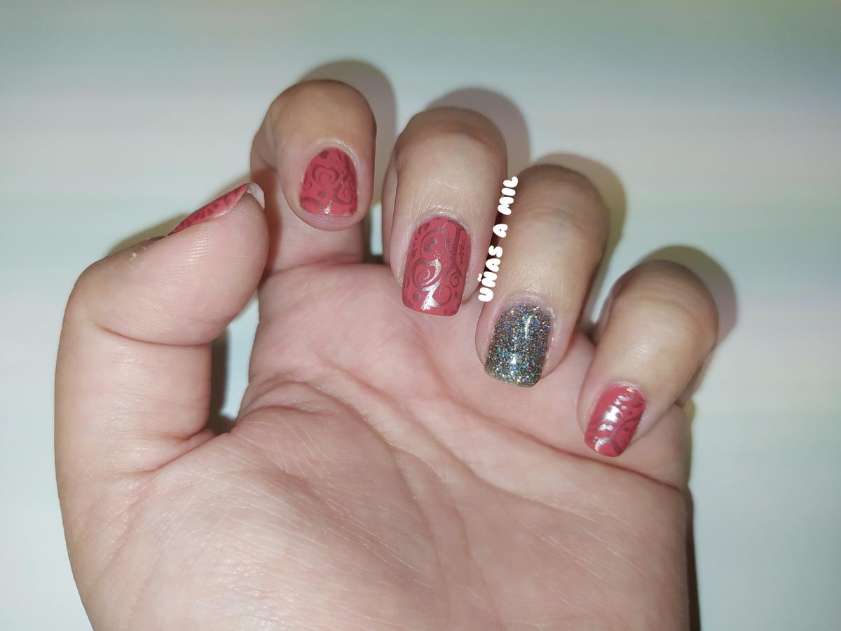 Para esta manicura tan sencilla, he utilizado la técnica de estampación con un diseño de enredaderas. Lo primero que he hecho ha sido pintar mis uñas de un esmalte que es un poco difícil de explicar porque es como un rosa oscuro, rosa teja, es un tono como mas marrón. Lo compré hace un par de años en la Feria Salon Look y es de Quiz Cosmetics, es el único que tengo de esta marca porque estos esmaltes no se venden donde yo vivo así que no se donde se pueden encontrar…y la verdad que es una pena porque este esmalte además de bonito y ”particular”, es de efecto gel sin lámpara, súper cubriente, cremoso, con mucho brillo, de secado rápido…vamos…¡¡que lo tiene todo!! y no sé donde encontrar mas esmaltes de esta marca…Si alguien los ha visto en España…¡¡¡que me avise!!! jejejeje.