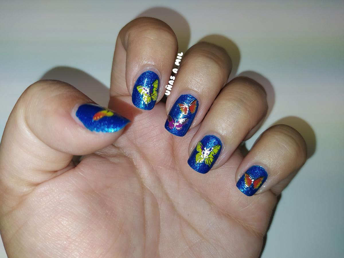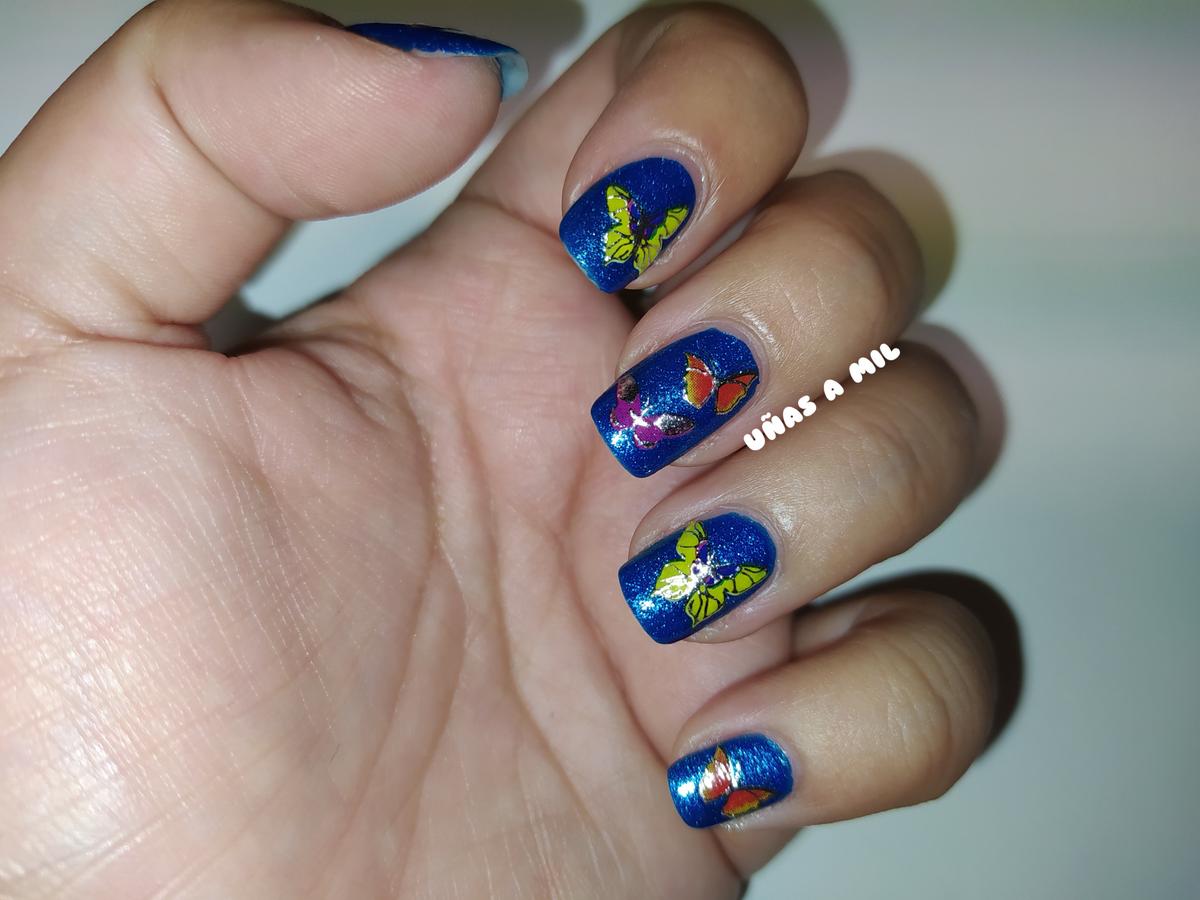 Para esta manicura, simplemente he utilizado unas pegatinas de mariposas en diferentes colores (amarillo, morado, naranja…) sobre una base de esmalte azul eléctrico precioso.