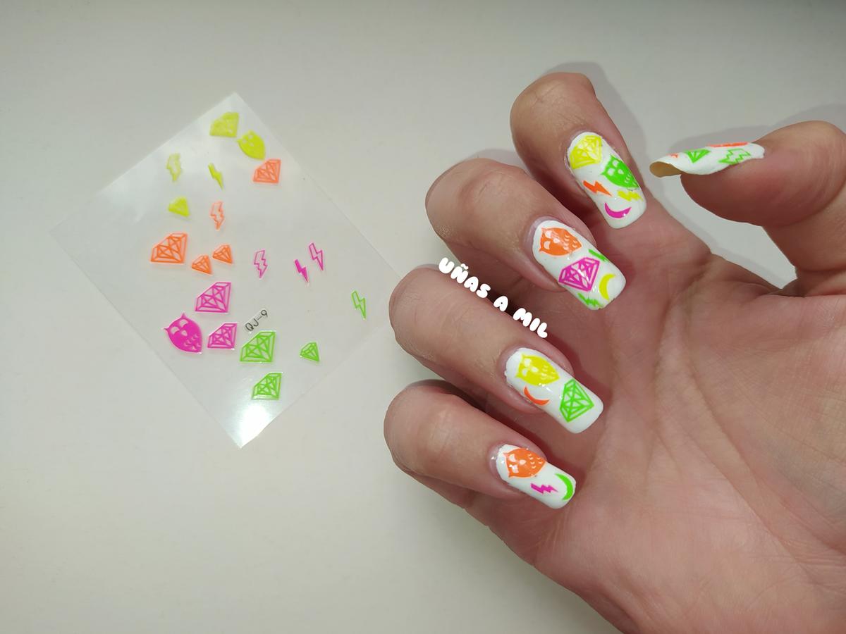Esta manicura tan fácil de hacer, lo único que lleva es una base con el esmalte blanco de Essence, y unas pegatinas en colores neón amarillo, verde, naranja y fucsia con distintos motivos (búho, diamantes, lunas y rayos).
