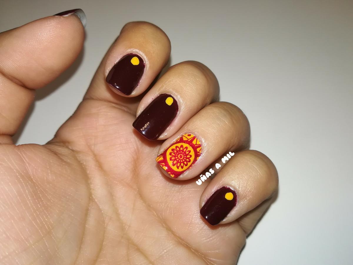 En la uña del dedo anular, he aplicado un par de capas del esmalte mostaza (aunque en la foto se ve mas en tono naranja), y he estampado con el mismo esmalte granate de Revlon.