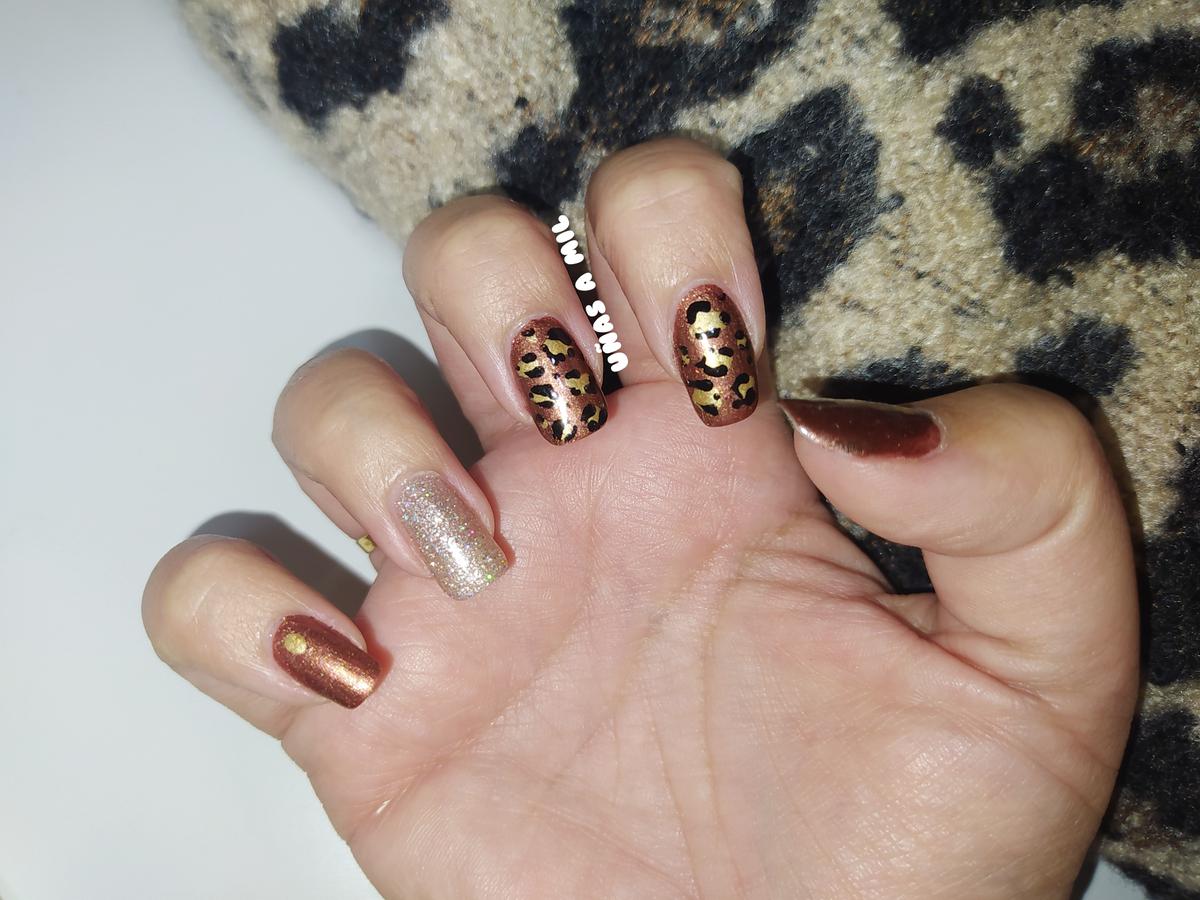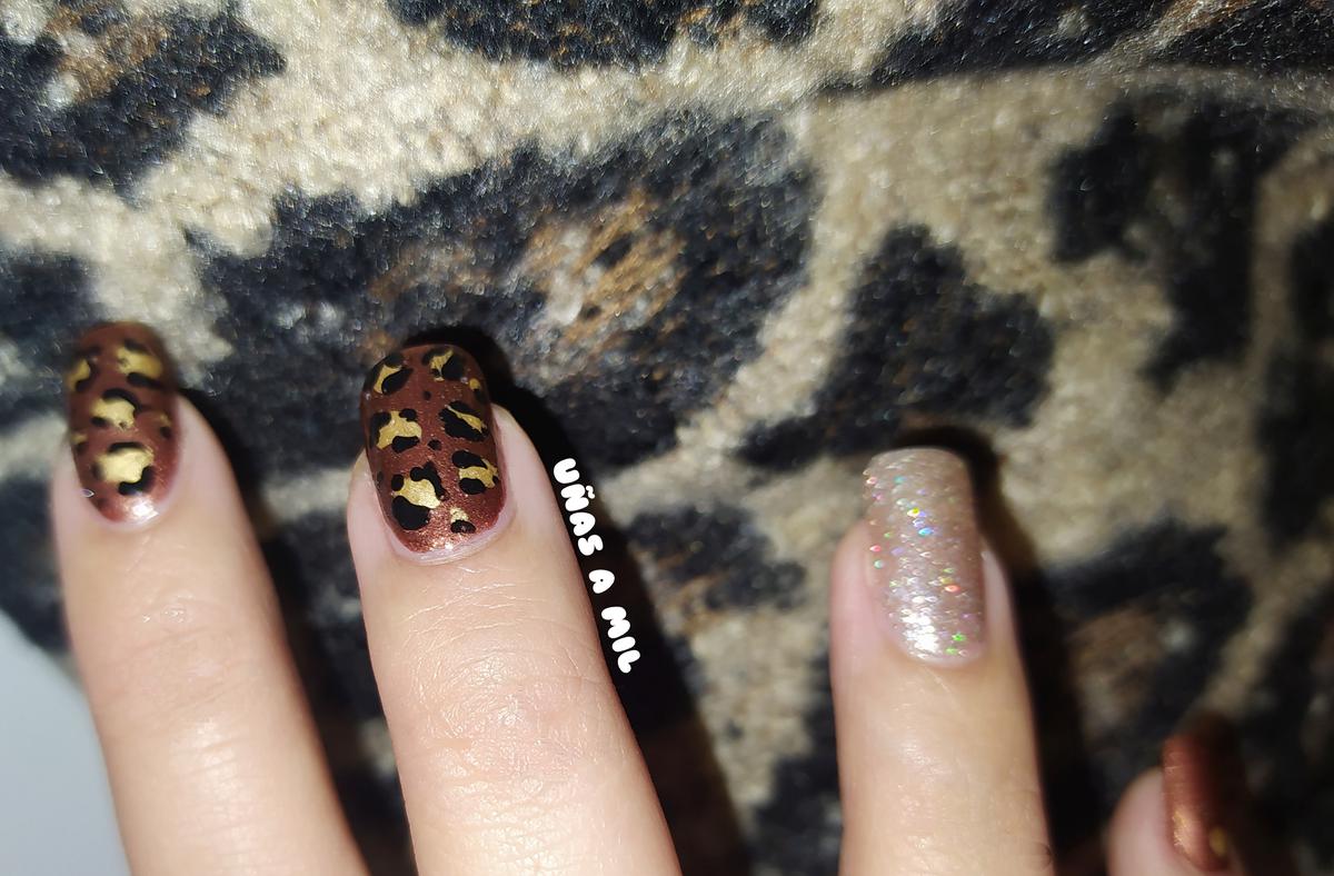 Este diseño de uñas que os voy a mostrar hoy es muy sencillo, un animal print elegante en tonos marrón y dorado con purpurina.