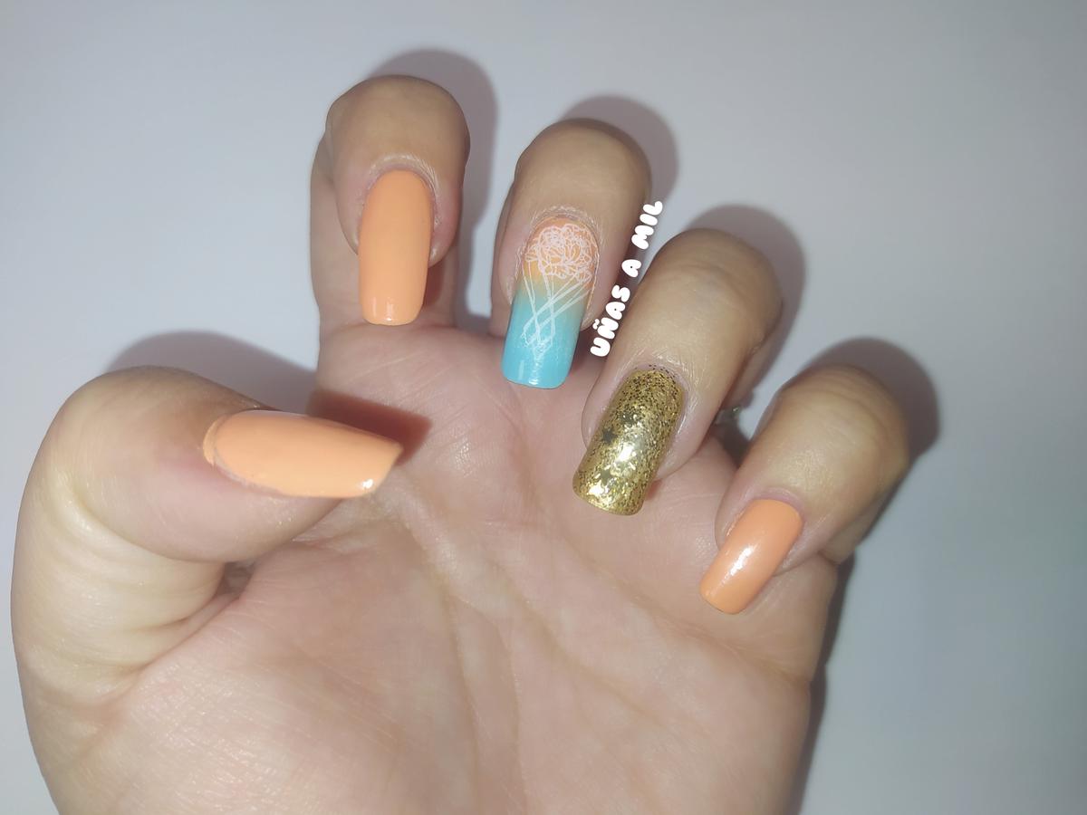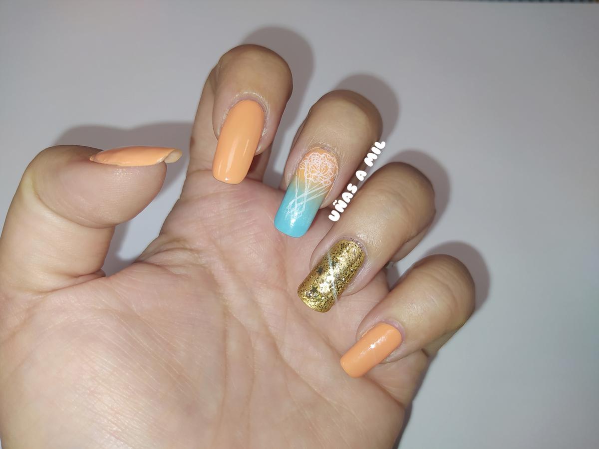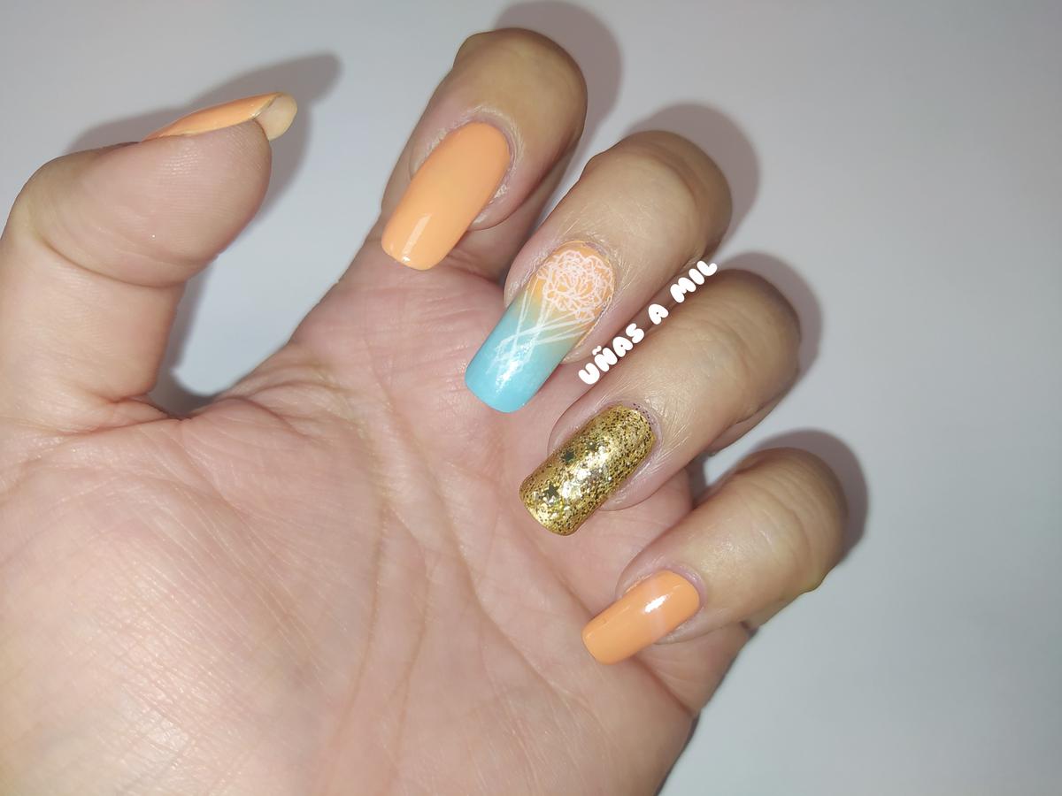 Como podéis observar, en la uña del dedo medio he realizado un efecto difuminado con esponja mezclando el azul con el naranja junto con la técnica de estampación con un diseño geométrico con flor.