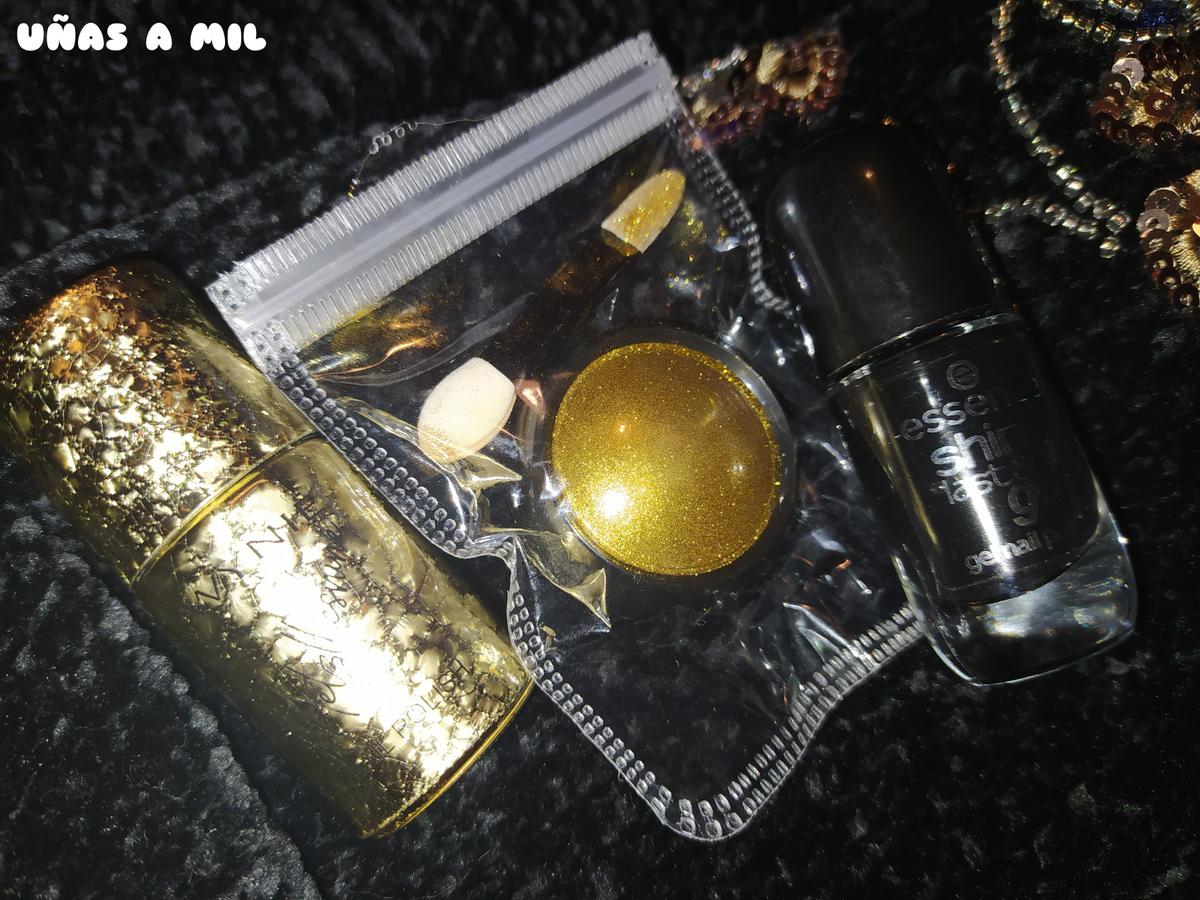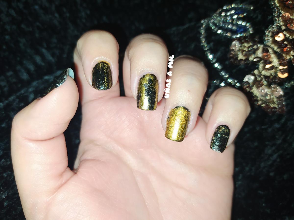 En el resto de uñas he utilizado los polvos efecto espejo de la web Born Pretty Store, en la uña del dedo anular lo he aplicado por toda la uña, y en el resto he dado pequeñas pinceladas para que se vea el contraste del dorado con el negro.