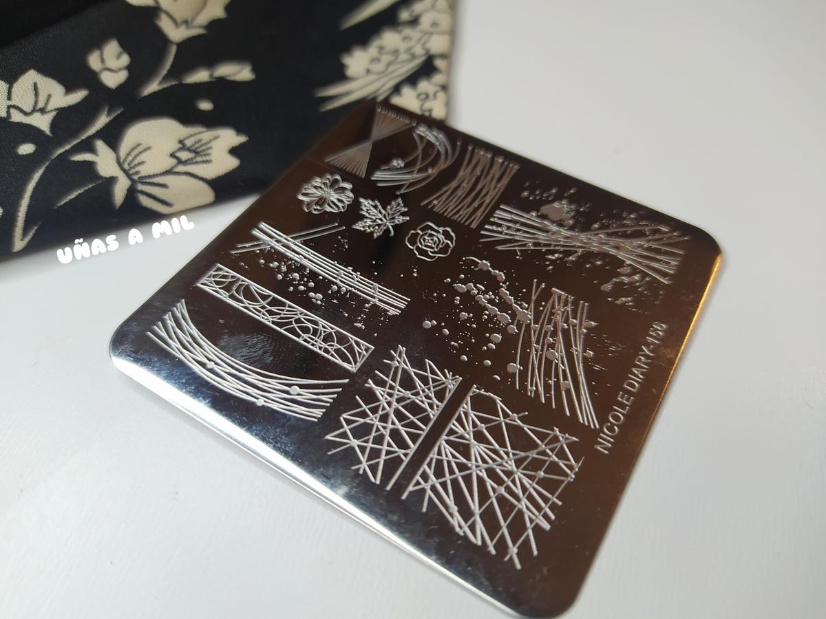 En la uña del dedo anular, sí que he utilizado la técnica de estampación con una placa de diseños para uñas de Nicole Diary que compré en la web de Born Pretty Store, es de las últimas compras que hice, así que si os ha gustado seguramente aún haya stock y podáis comprar, aquí podéis ver mas fotos: https://unasamil.wordpress.com/2020/09/18/compras-de-productos-de-unas-en-la-web-born-pretty-store/