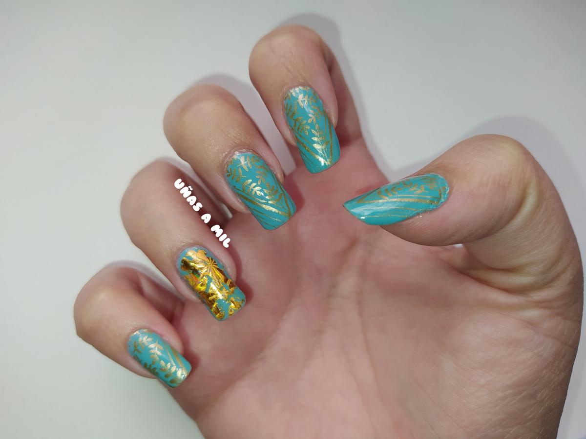 Para esta manicura, en una de las uñas puse papel foil, y en el resto utilicé la técnica de estampación con un diseño floral.