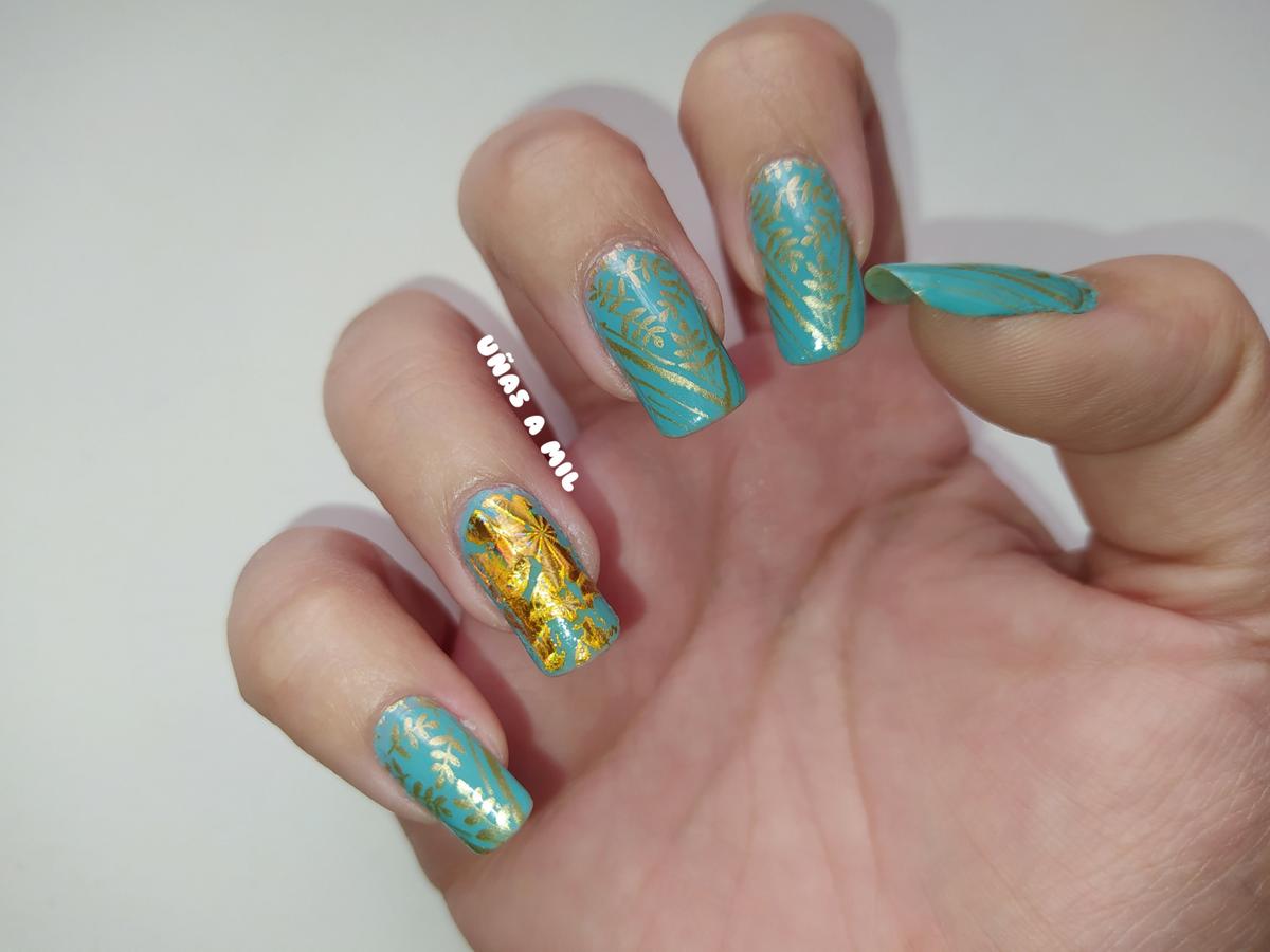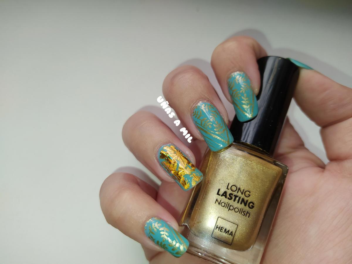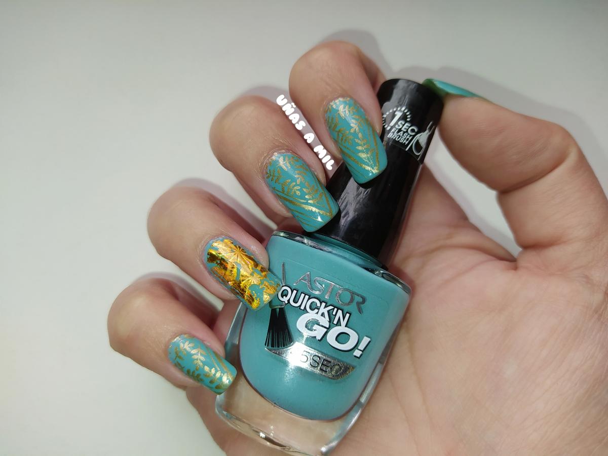 Los esmaltes que he utilizado han sido el dorado metalizado de Tiendas Hema, que ya habréis visto en muchas de mis manicuras, y el verde menta de Astor, en concreto es el nº 379, y es un color difícil de explicar porque es un verde azulado, según la luz se ve de un tono menta o azul, y lo compré en Primor.