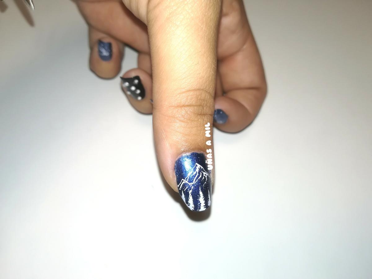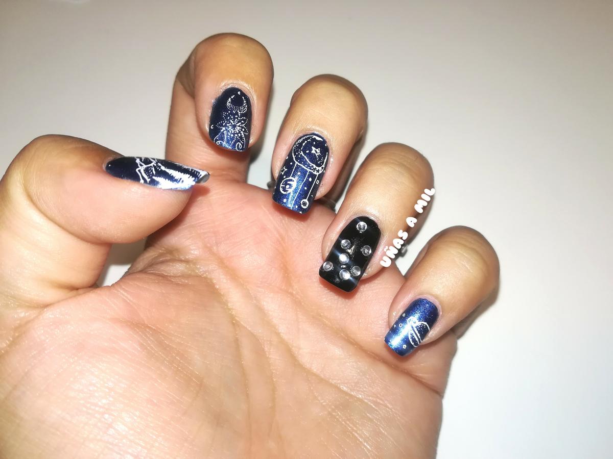 Como esmaltes he utilizado uno azul tipo metalizado de la marca The Color Workshop que se denomina ”Denim”, y para dar un toque distinto, en la uña del dedo anular llevo el esmalte negro de Essence, con unas piedras plateadas imitando a las constelaciones.