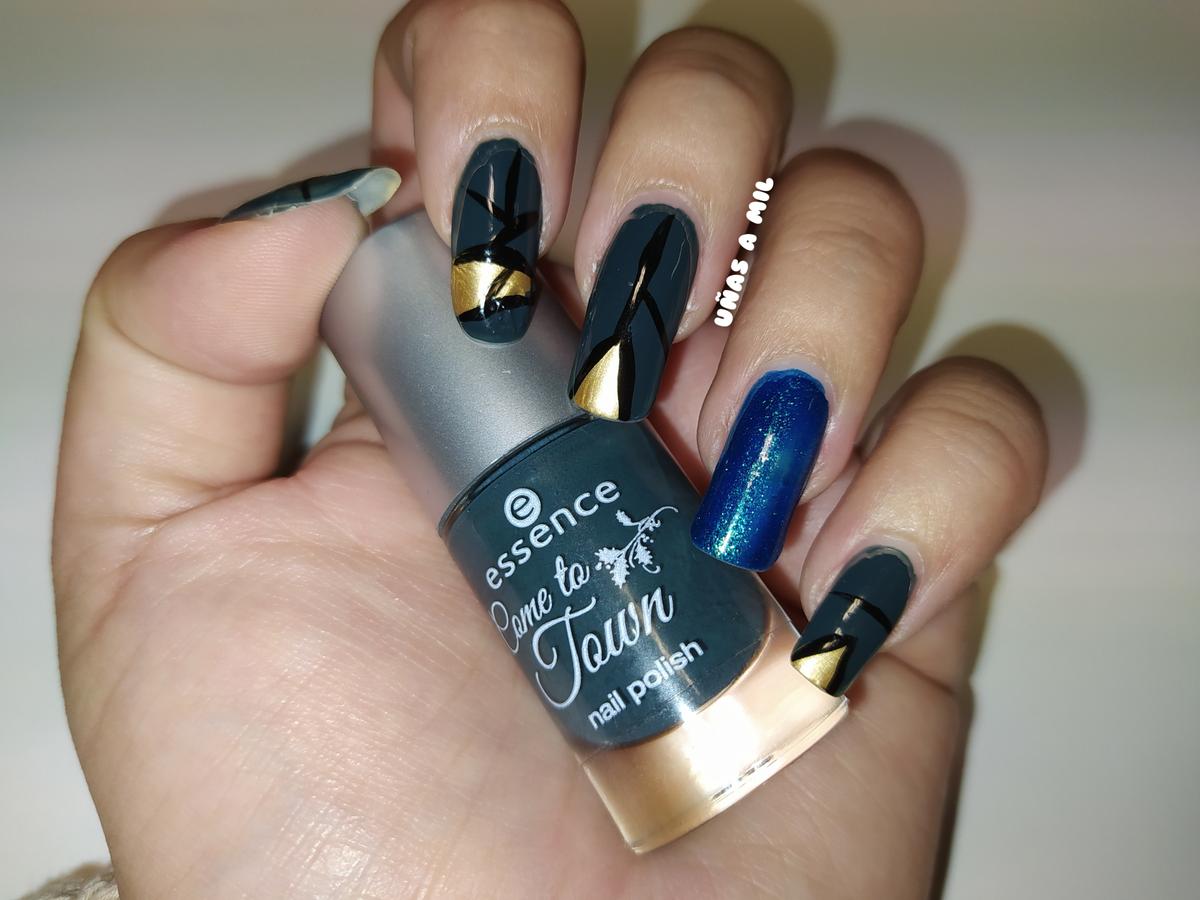 Lo primero que hice fue pintar mis uñas de verde, luego con el mismo pincel del esmalte dorado, fui haciendo las figuras geométricas (triángulos, rectángulos…lo que fuera saliendo, porque ni lo pensé), y a continuación, con un esmalte negro de pincel fino hice las líneas. En la uña del dedo anular, he utilizado un esmalte verde azulado con shimmer.