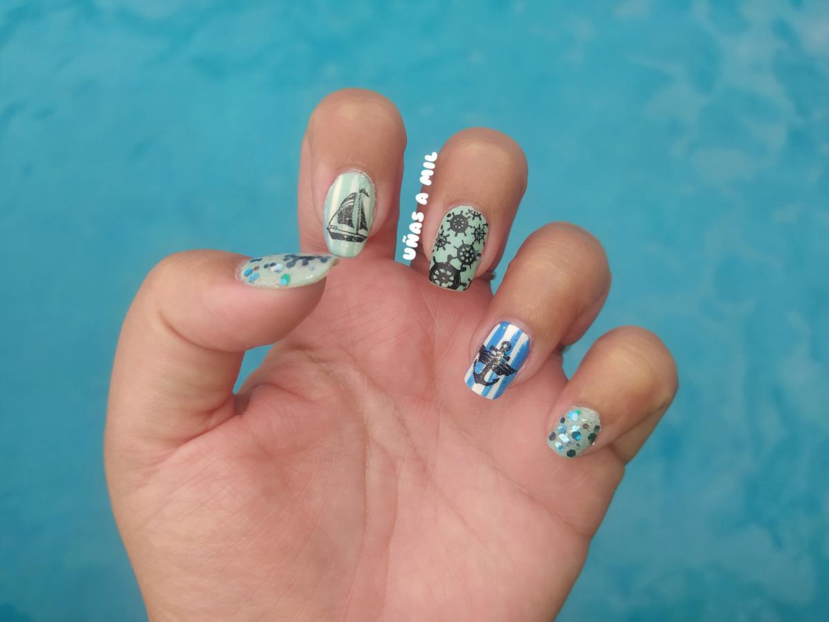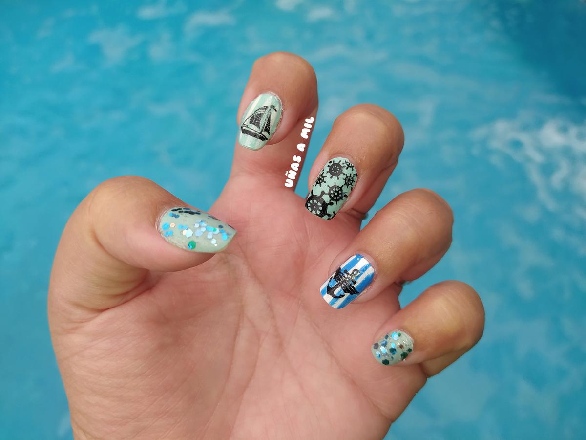 Como podréis observar, esta manicura está realizada con la técnica de estampación, para ello he utilizado distintas placas con motivos marineros (barco, velero, ancla, timón…).