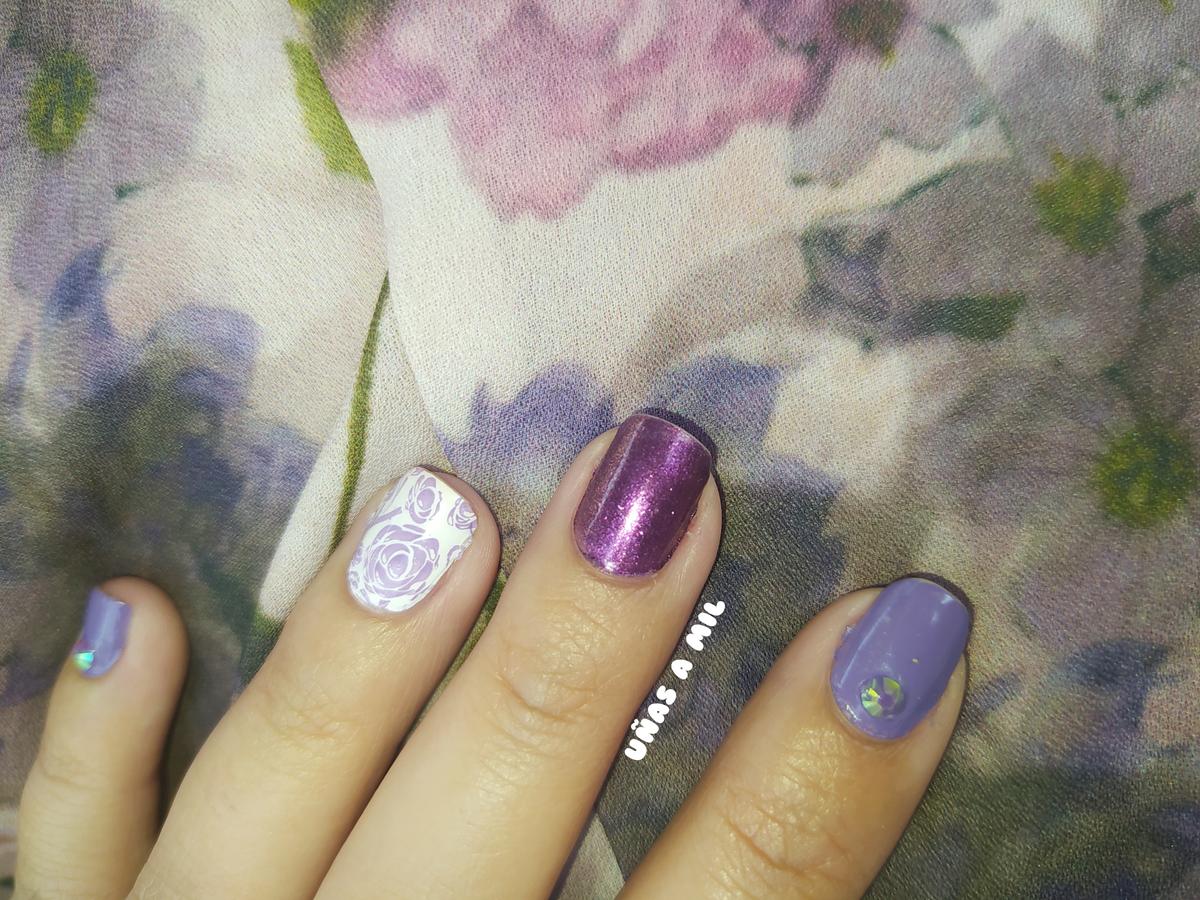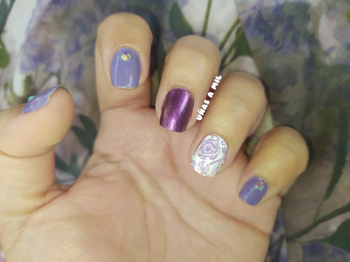 Lo que hice fue un mix and match en el que pinté 3 de mis uñas en un tono lila, en el que apliqué una piedra holográfica, en la uña del medio solamente la pinté con el esmalte morado que es de la antigua colección de Kiko que se llamaba ”Sun Show”, y en la uña del dedo anular utilicé la técnica de estampación con un diseño de flores.