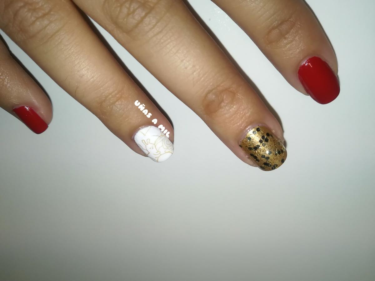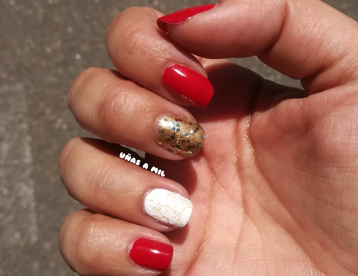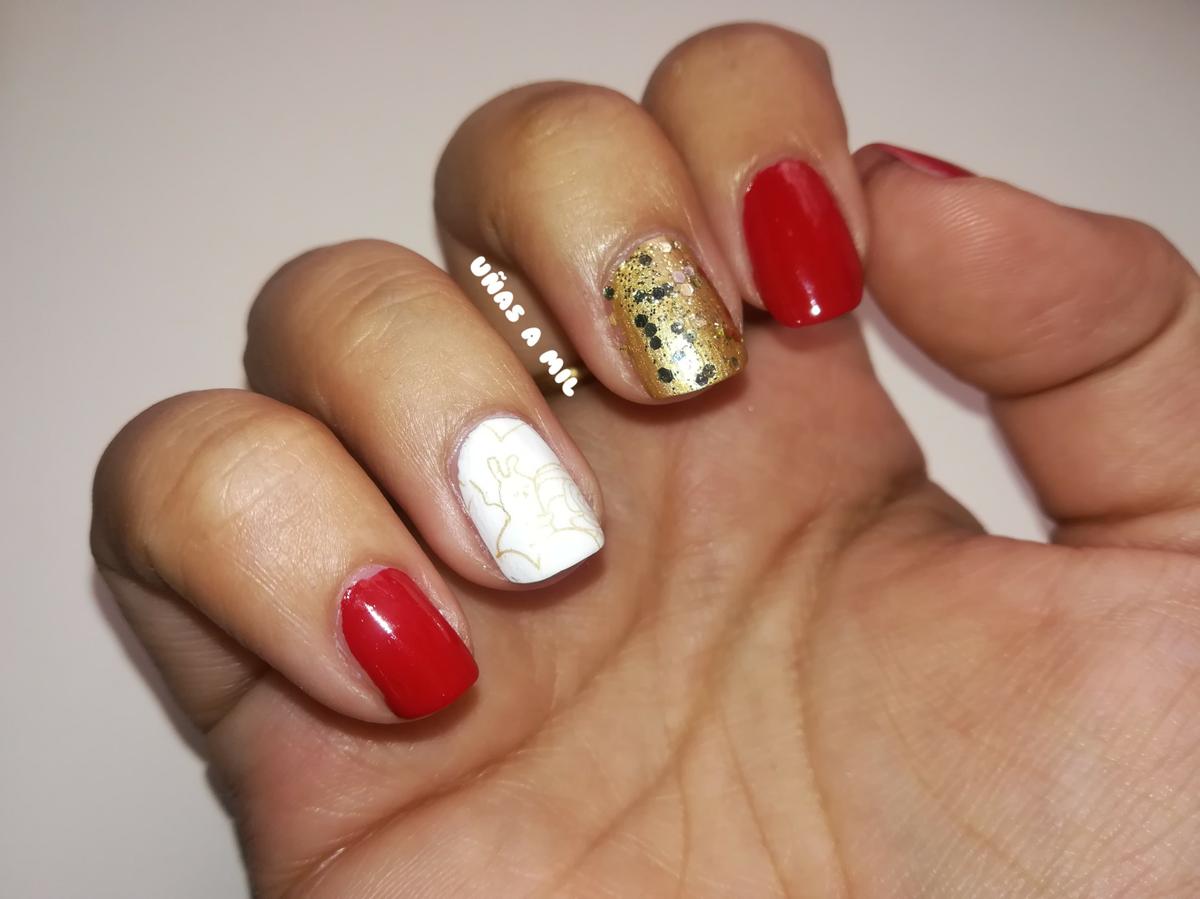 Este diseño de uñas es muy fácil de hacer, y además queda muy bonito y elegante, lo que he hecho ha sido pintar tres uñas en rojo, una con esmalte dorado y purpurina glitter, y en la uña del dedo anular en blanco utilizando la técnica de estampación con un diseño amoroso de un conejito abrazado a un corazón.
