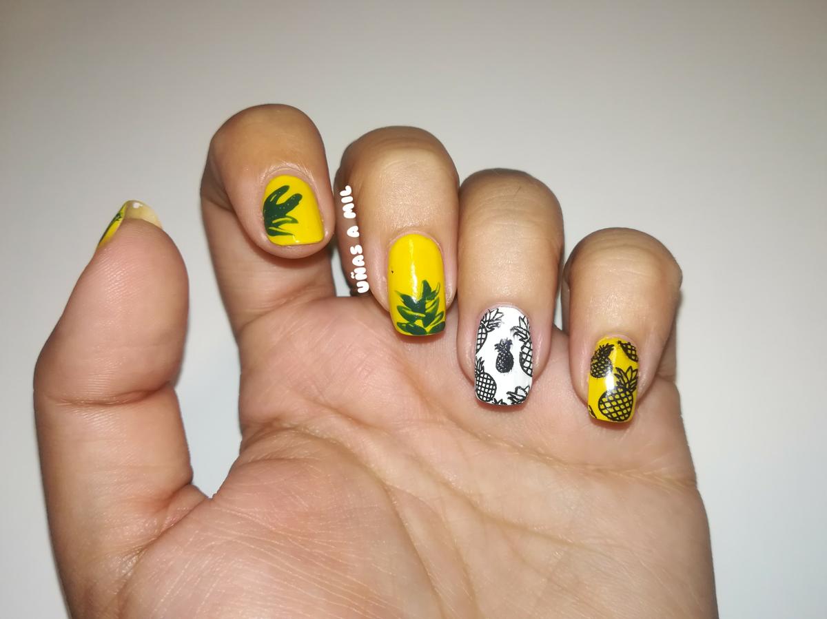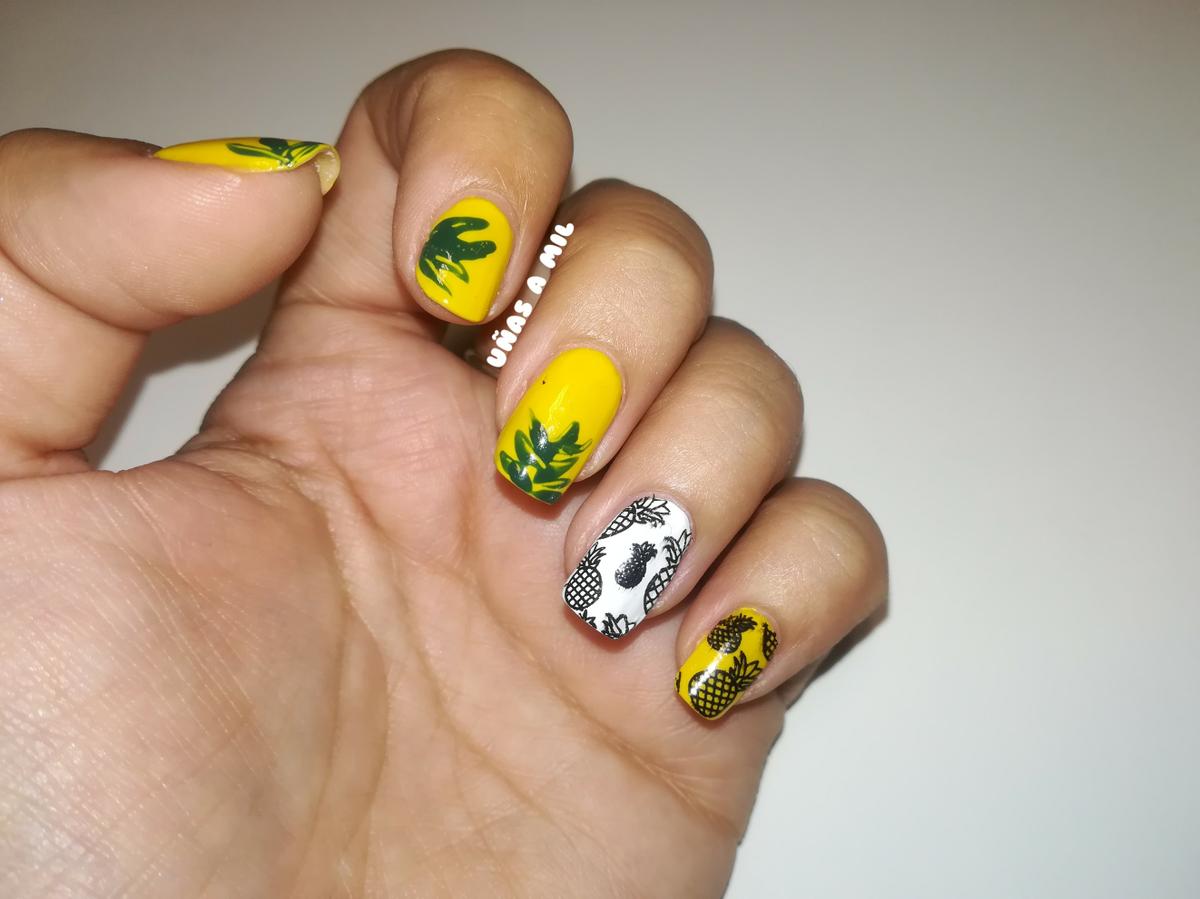 En las uñas amarillas he pintado ”a mano” las hojas de la piña, lo podéis hacer con pincel, con dooting tool…incluso con un palillo, porque además no se necesita ser muy preciso.