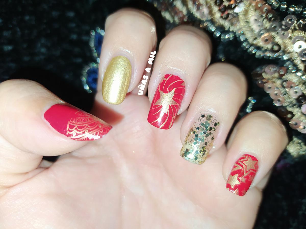 He utilizado la técnica de estampación con varias placas, una de bolas de Navidad que llevo en la uña del dedo pulgar, y otra con diseños de estrellas que igualmente valen para las fechas navideñas.