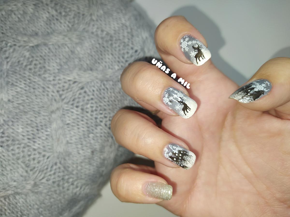 Si para estas fechas queréis huir del típico rojo, aquí os muestro un diseño de uñas difuminado en tonos grises y blanco con paisaje de invierno, copos de nieve y renos. Vamos…¡¡una manicura que lo tiene todo!!