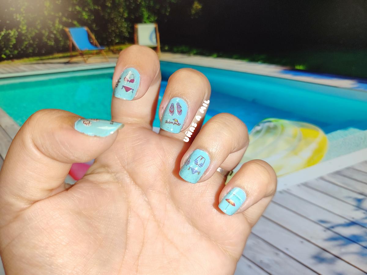 Como podréis observar, para esta manicura lo que he hecho ha sido pintar todas las uñas iguales, en un tono azul claro, y he pegado unas water decals con motivos piscineros: bikinis, chanclas, sombrillas…