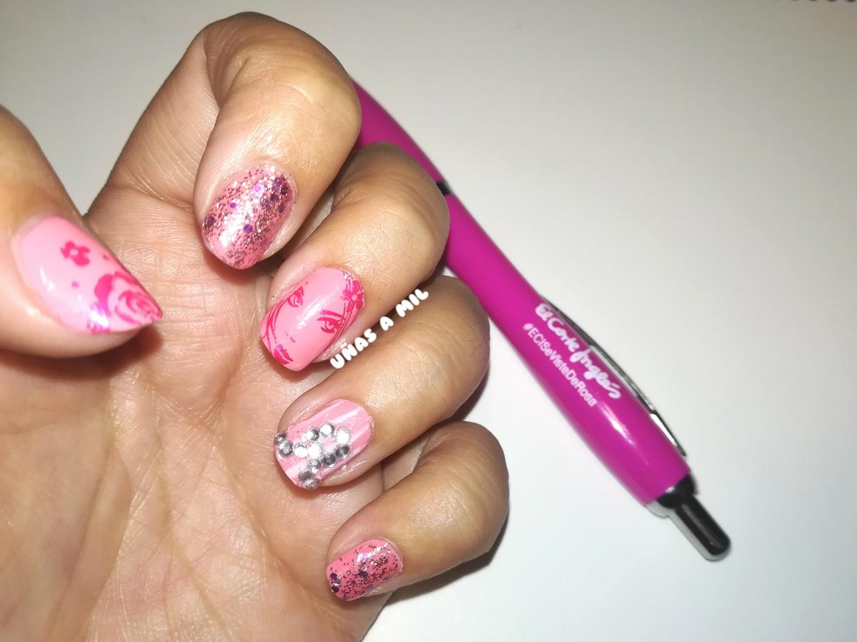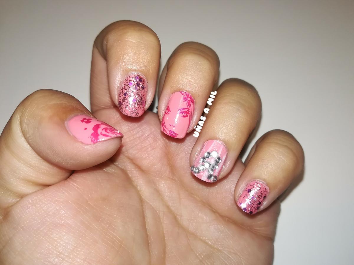 Para esta manicura tan preciosa, he utilizado varias técnicas, la estampación y también ”a mano”, en dos de mis uñas he estampado unas rosas y una cara de una mujer, en otras dos he utilizado un esmalte de purpurina glitter en rosa, y en la uña del dedo anular he hecho ”a mano” unas líneas en blanco con un lazo de la mujer en pedrería plateada.