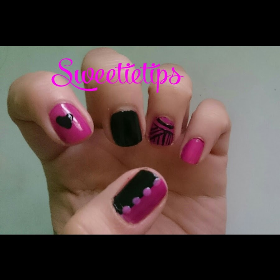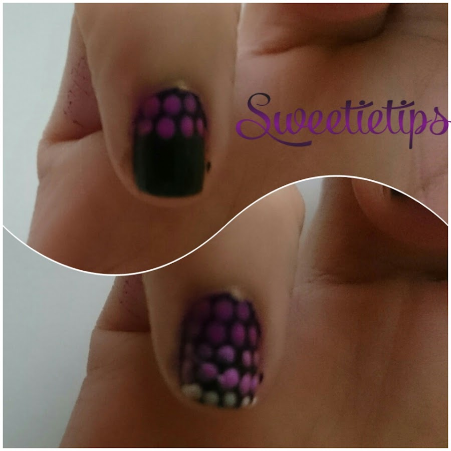 Por último, en la uña que este pintada mitad de negro y mitad de fucsia vamos a hacer pequeños círculos de un rosa mas claro justo en la división de los 2 colores y ¡LISTO!