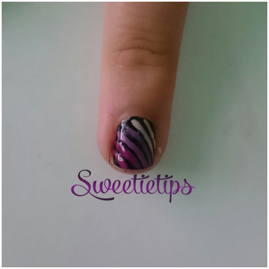 Para la siguiente uña, vamos a hacer otro degradado pero esta vez con lineas desde la esquina superior de la uña a la esquina inferior, vamos a trazar dos lineas de cada color empezando desde el má claro al más oscuro