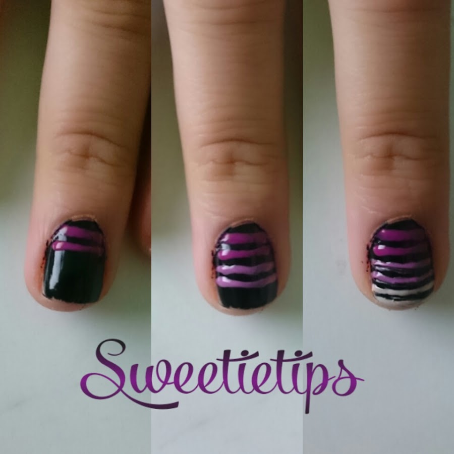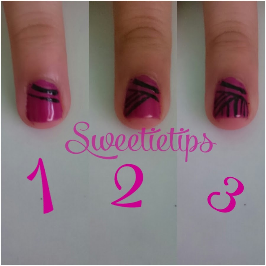 En primer lugar, vamos a pintar 3 uñas de color fucsia, una de negro y la última vamos pintar la mitad negro y la otra mitad fucsia tal y como muestro en la imagen.