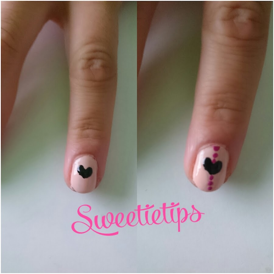 Para la cuarta uña vamos a hacer un corazón en medio de la uña con el color negro de la misma forma que en el diseño anterior, vamos a hacer 2 círculos y después los vamos a unir. A continuación, vamos a coger el rosa más oscuro y vamos a trazar pequeños círculos haciendo una linea vertical por todo el medio de la uña y del corazón pero sin tocarlo tal y como muestro en la imagen.
