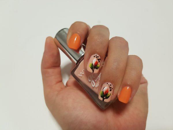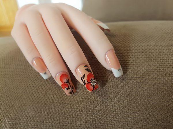 Para realizar esta decoración de uñas francesas con flores, lo primero que debes hacer es esmaltar cada uña en color coral.