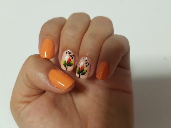 Con esmalte en color coral oscuro debes esmaltar tres de las uñas y las otras dos uñas, las del dedo anular y la del dedo del medio las esmaltarás también en color coral pero más claro.