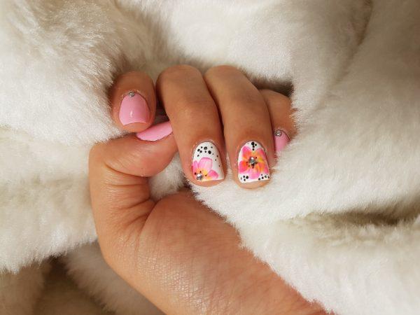 En segundo lugar debes esmaltar cada uña, tres en rosado, y las uñas de los dedos anular y el del medio en color blanco.