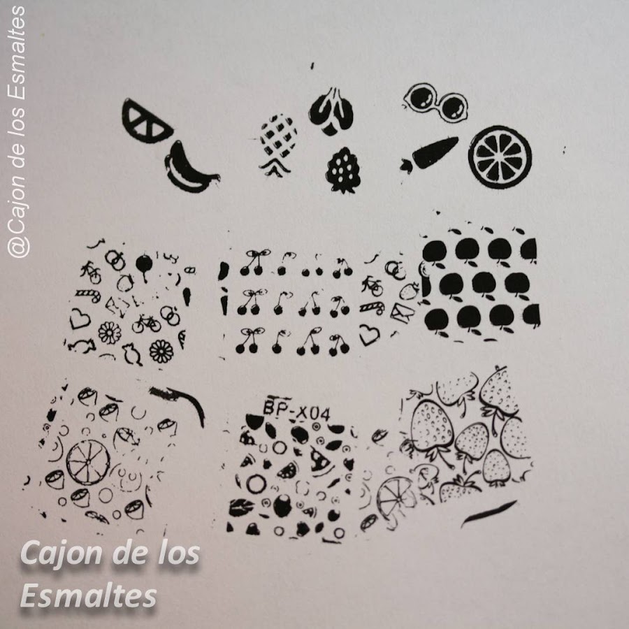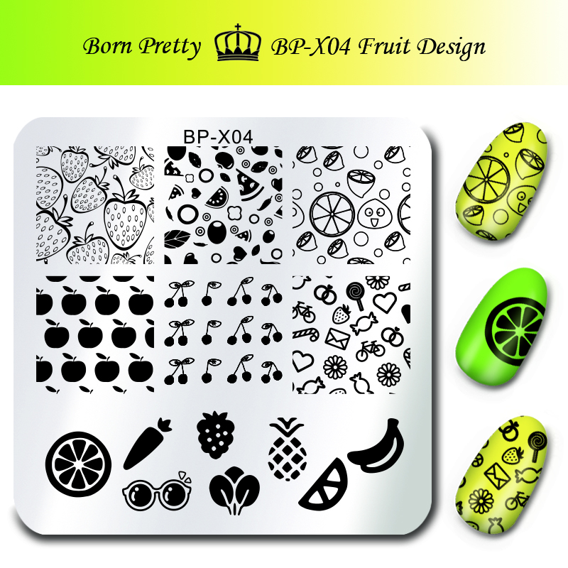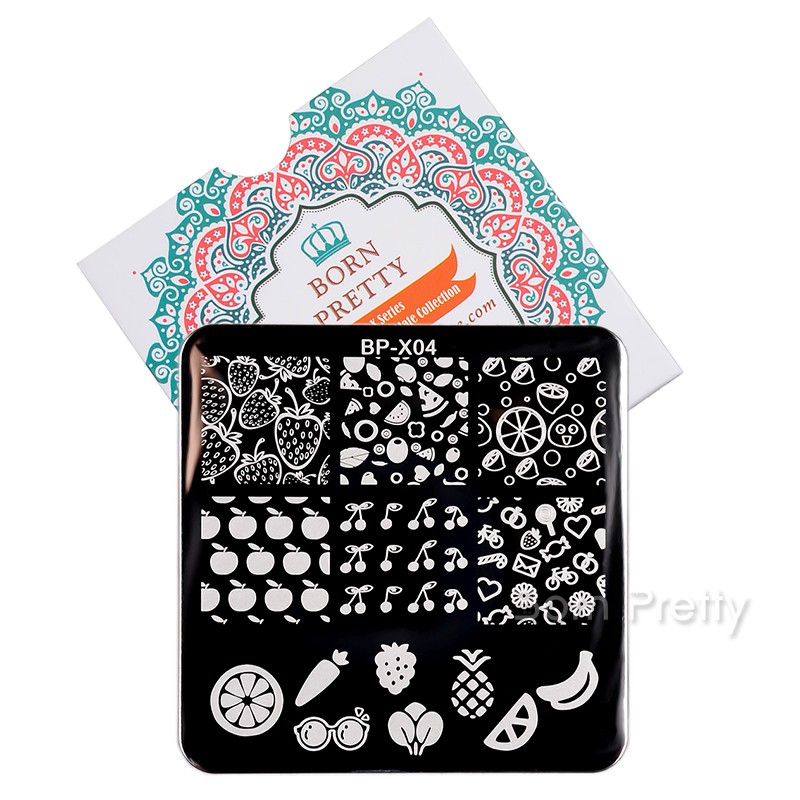La placa es de la penúltima (?) tanda que sacó la tienda de nail art Bornpretty Store. Les dejo el enlace, esta llena de diseños frutales bien veraniegos: http://www.bornprettystore.com/born-pretty-66cm-square-nail-stamp-template-fruit-design-image-plate-p-29977.html. En este momento andan de oferta en USD1.59 con envío gratis a todo el mundo.