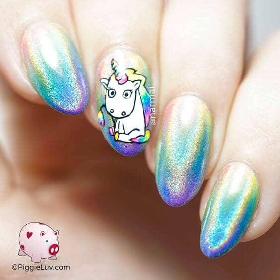 Estas magníficas uñas iridiscentes de brillo son coloridas y vibrantes. Los colores se arremolinan desde un suave amarillo hasta un rico púrpura. Encima del brillante esmalte hay una pequeña figura de unicornio, sentada en el medio de la uña y con un aspecto lindo y torpe. El contraste entre el acabado brillante e iridiscente y la adorable pintura a mano hace que estas uñas sean especiales.