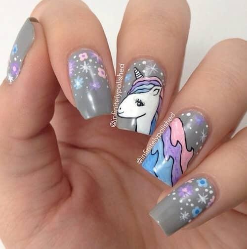 Estas uñas únicas están hechas con una base de color gris paloma medio. Pequeñas flores pintadas a mano, lunares y estrellas acentúan la base de las uñas. Un precioso unicornio y su melena se extienden por dos de las uñas adyacentes. Este es un diseño sutil y no tan avanzado como algunos de los otros que vimos, pero le hará saber a todos cuánto amas los unicornios.