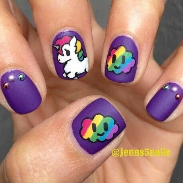 Estos lindos diseños de uñas fáciles tienen un fondo púrpura mate. Encima del púrpura mate están pintadas dos nubes felices de arco iris y un pequeño unicornio con una melena de arco iris. El arte tiene un aspecto encantador y estrafalario. En dos de las uñas, hay adornos nacarados en rosa y plata.