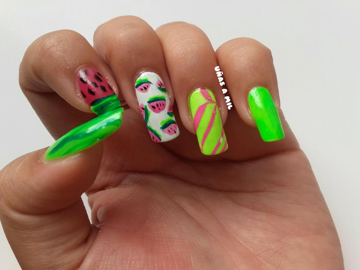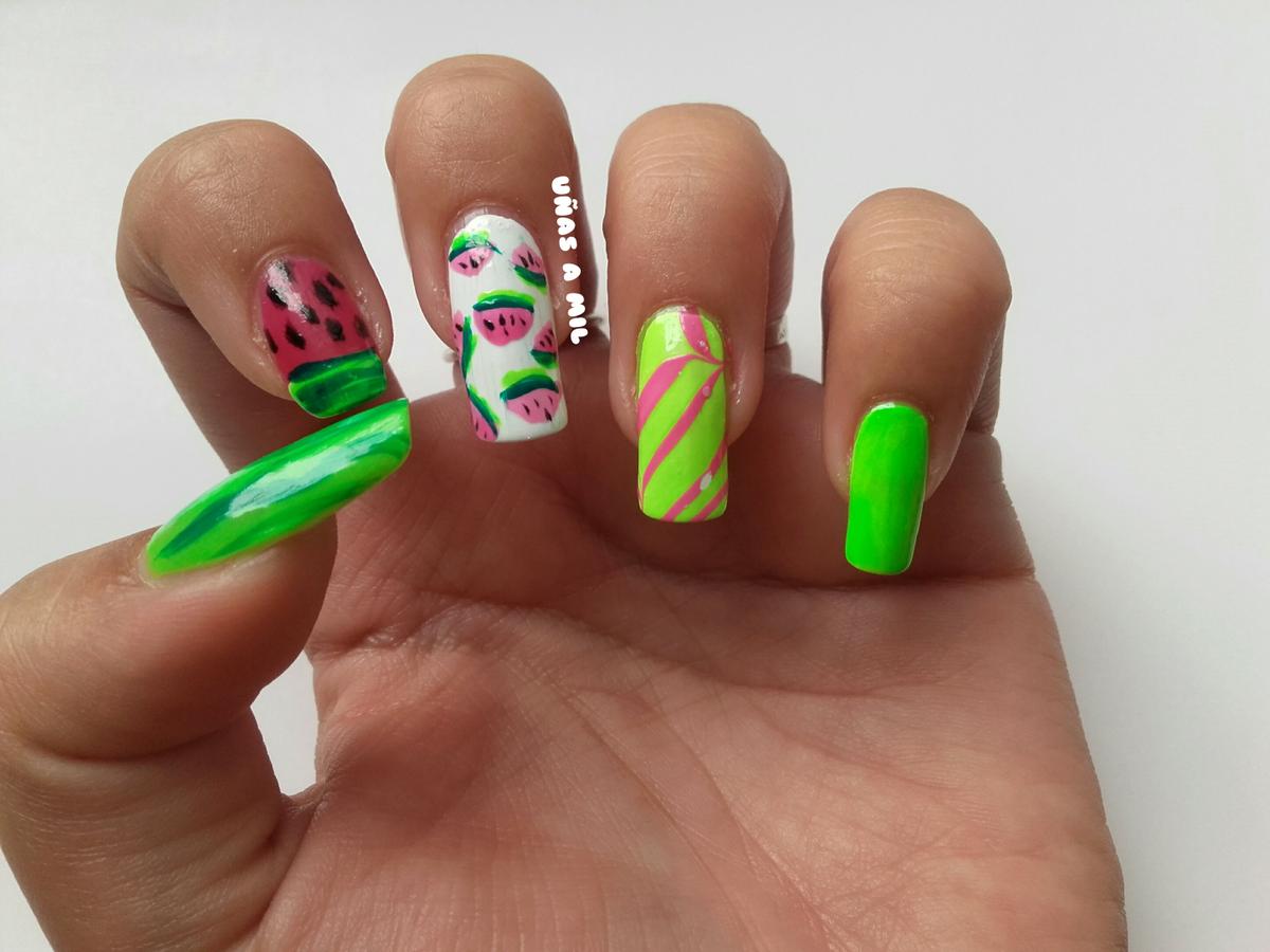 En la uña del dedo gordo, he imitado la corteza de la sandía utilizando el esmalte ”Eléctrica” (sin base blanca), y pinceladas del verde especial para nail art.