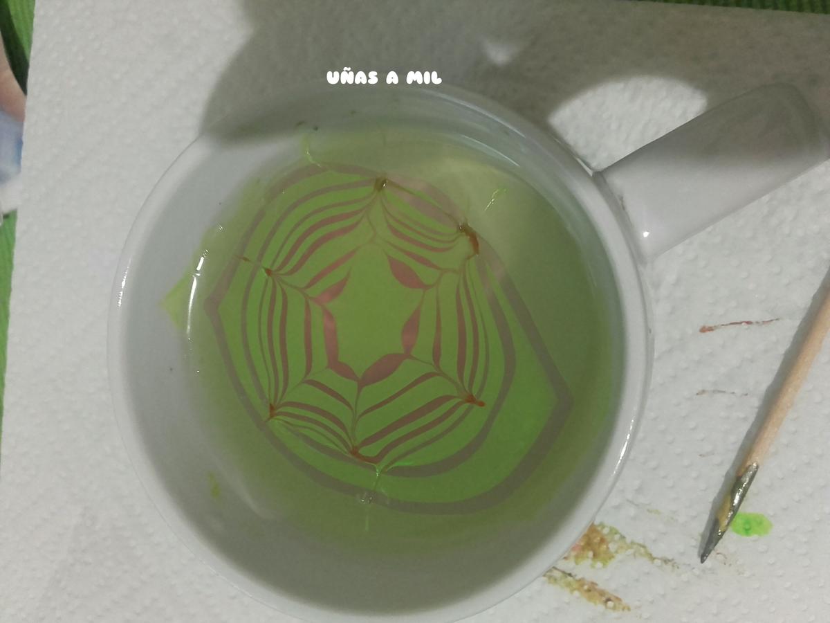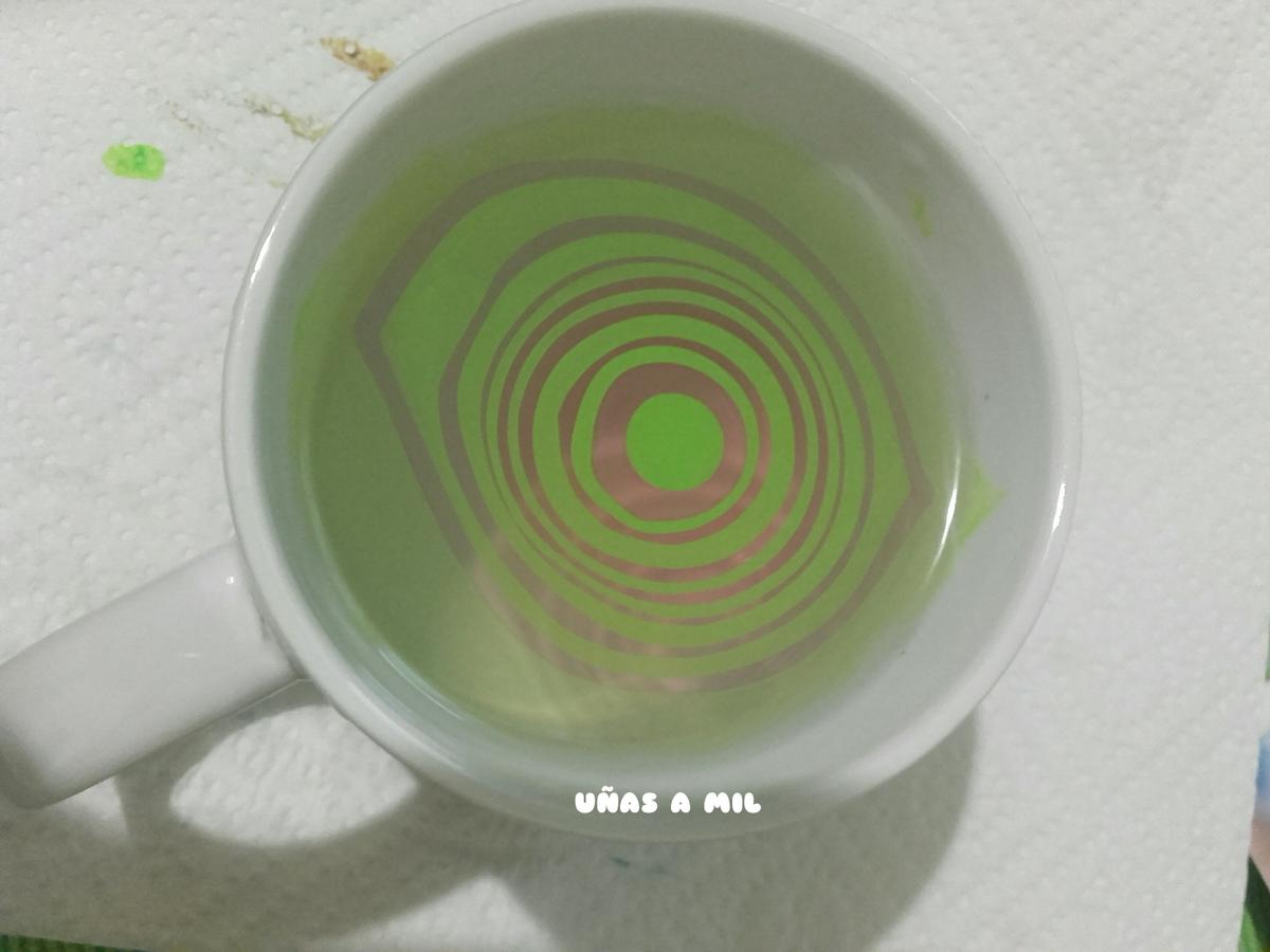 Para las que no sepáis como es esta técnica, se basa en echar gotitas de esmaltes de distintos colores en un vaso de agua, y con la ayuda de un palillo o palito de naranjo, puedes hacer las formas que quieras en el agua e introducir la uña hacia abajo en el vaso. Luego hay que retirar los bordes ya que es una técnica bastante sucia, os dejo unas fotitos de lo que hice: