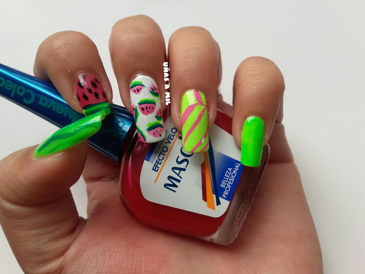 En la uña del dedo índice, he dibujado una sandía con sus pepitas utilizando el esmalte negro de pincel fino, también de Masglo.