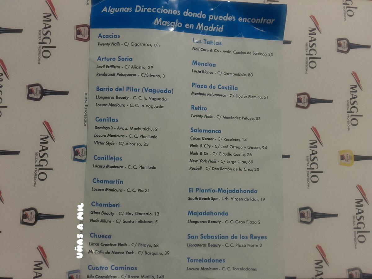 Como me preguntáis bastante donde comprar estos esmaltes Masglo en Madrid, aquí os dejo un listado de las tiendas físicas donde los venden, para que así podáis ver en persona los tonos que hay, ya que muchas veces compramos por internet ”a ciegas” y no se refleja muy bien cómo es cada tono. Espero que os sirva de ayuda.