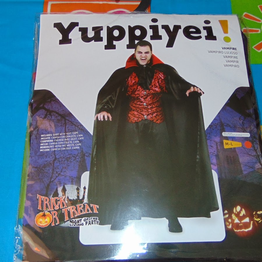 Para mis chicos favoritos opté por una versión mas elegante de Vampiro de talla única M/L que aunque es un poco más grande de la talla que ellos usan me parecio muy práctico para meter ropa por debajo ya que por el norte tanto en Carnaval como en Halloween suelen ser fechas de mucho frío, además es un traje de manga larga que consta camisa y chaleco unidos, pantalón y capa; vamos super completo no le falta detalle alguno y por un precio de 21,90.