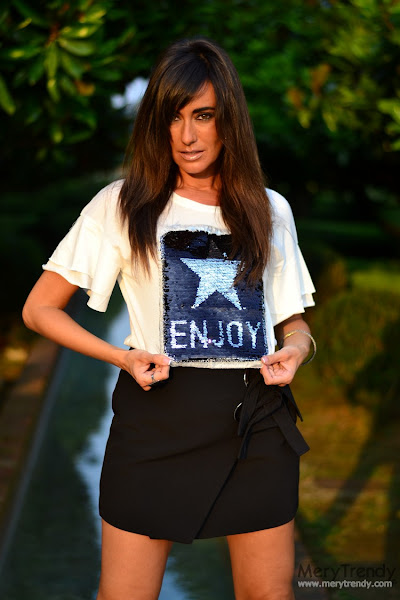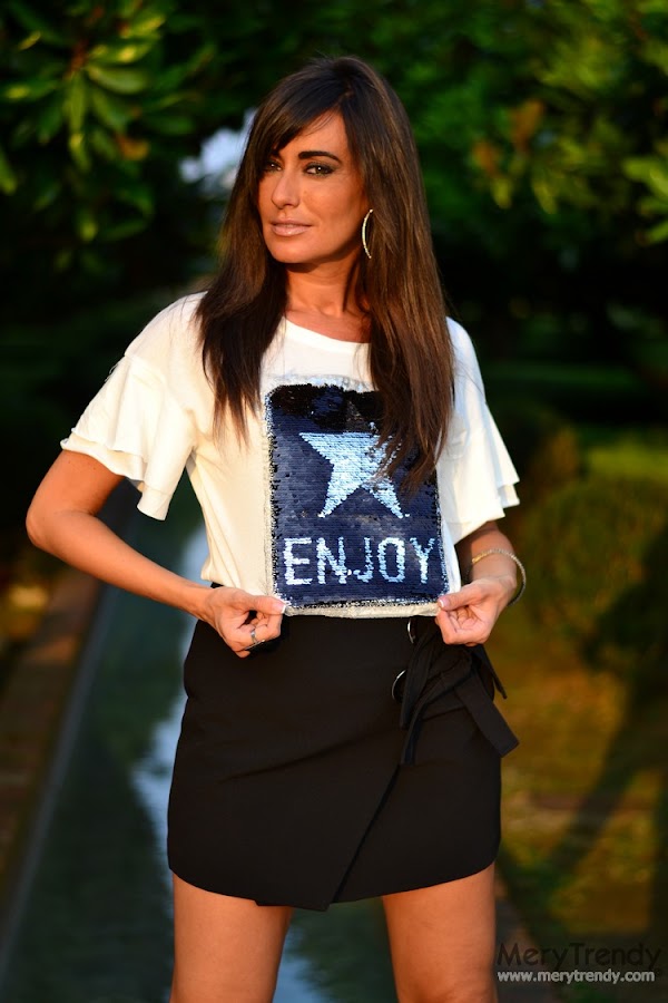 Hoy miércoles, todo el protagonismo se lo lleva mi nueva camiseta de paillettes "ENJOY"; un mensaje sencillo, rápido y directo que invita a DISFRUTAR y eso es precisamente lo que he hecho yo haciéndome estas fotos para después enseñaros cómo quedaba puesta la camisetita en cuestión: DIVERTIRME. Lo cierto es que me he reído mucho.
