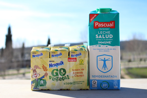 Las bebidas de la Disfrutabox de Enero son estas dos, por un lado los bricks de bebida de avena y cacao Nesquik Go Vegetal, para dar un capricho a los peques de la casa y para los mayores, leche Pascual semidesnatada que ayuda a reforzar el sistema inmune, ¡bien!.