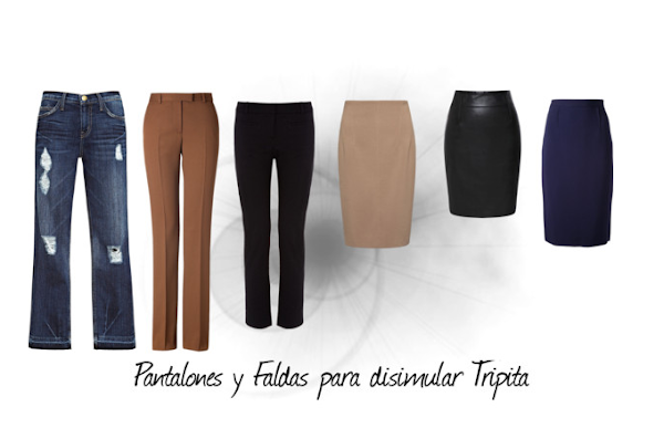 For BOTTOM GARMENTS, we must choosepants and skirts that we remain at the waist or just below it, so we can hide thetummy. We should also opt for straight cuts, nofrills, embellishments or pleats, and preferably in dark tones, leaving the colorful garmentsfor the upper part of the body.