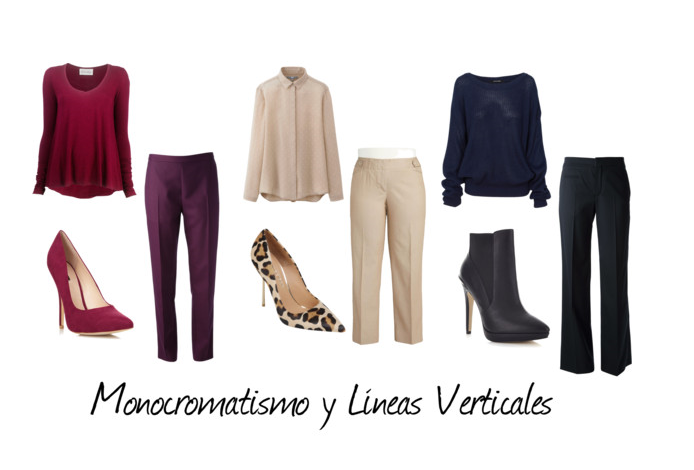 En líneas generales, buscaremos prendas que creen sensación de verticalidad en el cuerpo, utilizando líneas rectas, tejidos con caída y peso monocromáticos, y evitado los contrastes de color entre la parte alta y baja del cuerpo. Debemos evitar especialmente los tejidos elásticos y las prendas ajustadas. Un poco de tacón en el zapato nos ayudará a crear sensación de mayor esbeltez. También debemos potenciar la parte superior de nuestro cuerpo con un buen maquillaje y arreglo del cabello, de forma que desviemos la atención de la parte inferior de nuestro cuerpo que suele ser la que evidencia el sobrepeso. En este sentido, los complementos y accesorios nos serán de gran utilidad.