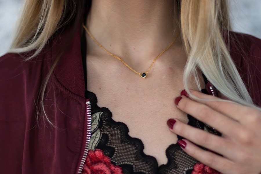 La he combinado con un top bralette de encaje negro y detalle bordado floral y unos jeans skinny básicos negros.