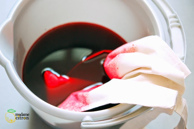 Primero diluimos el tinte rojo en un recipiente con agua e introducimos la parte inferior de la bolsa 20 minutos.