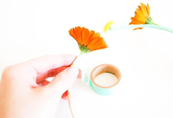 Una vez colocadas, empezamos a unirlas a nuestro alambre con ayuda de una cinta bonita. En este caso, yo elegí washi tape de color mint, porque me gustó el contraste con el naranja y el amarillo de las flores.