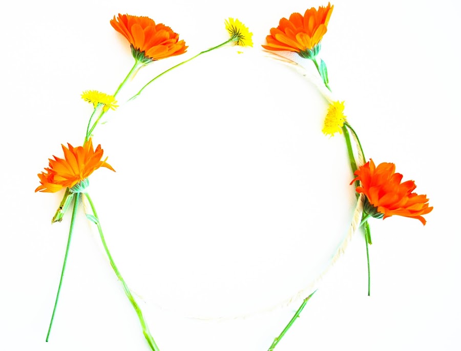 Le damos al alambre la medida de la cabeza (si nos vamos a poner la corona), lo enrollamos con cinta de carrocero o washi tape para que quede más blandito y distribuímos las flores como más nos guste.